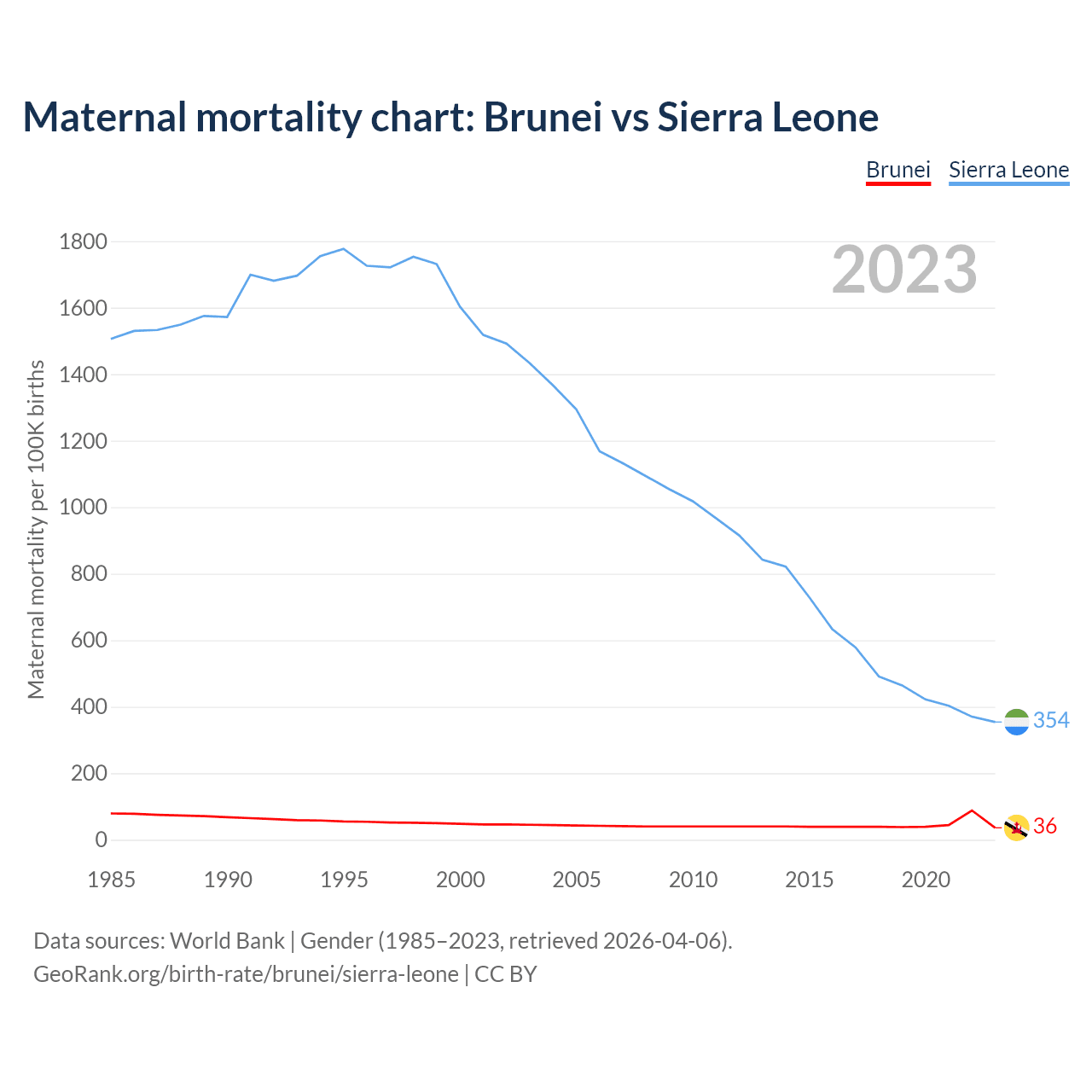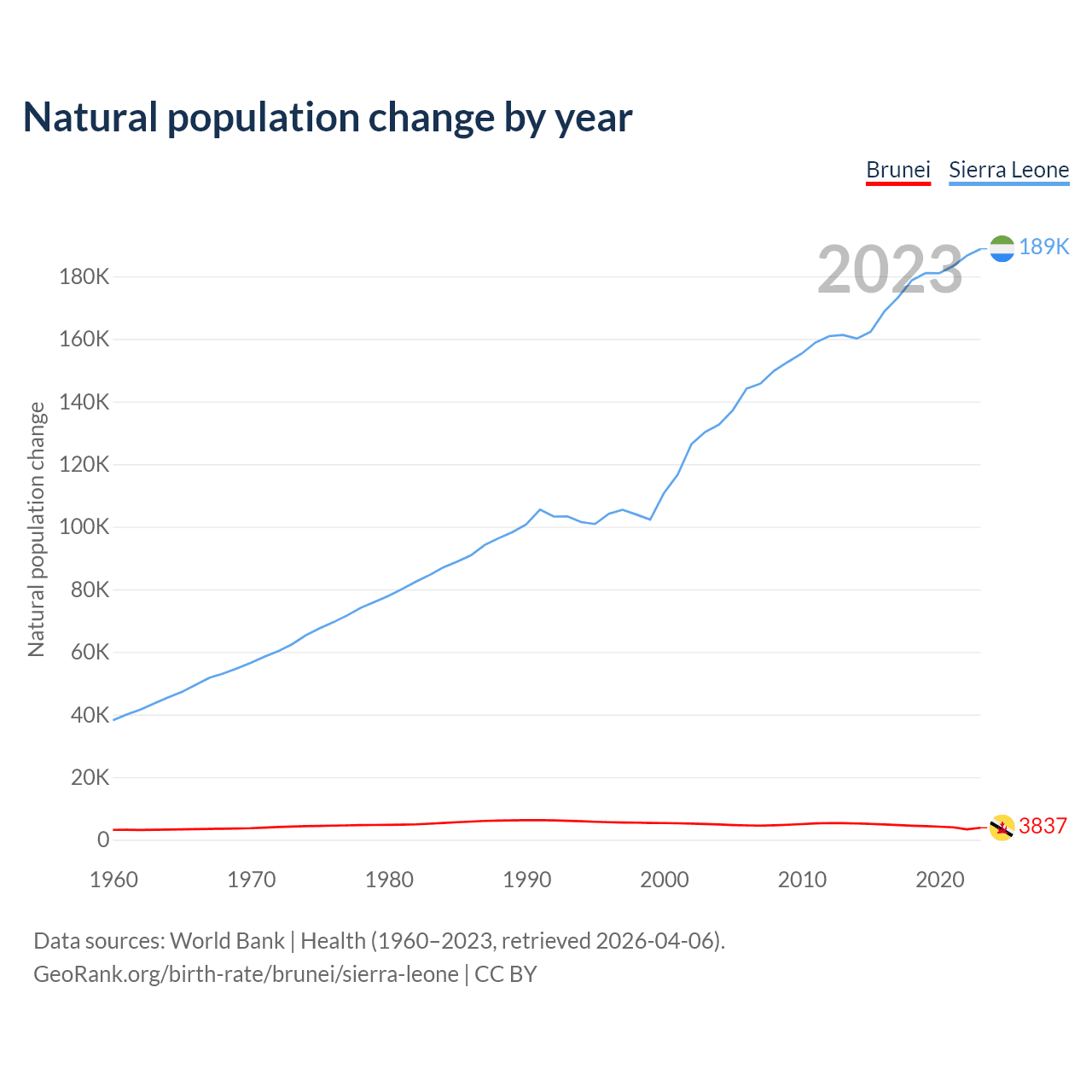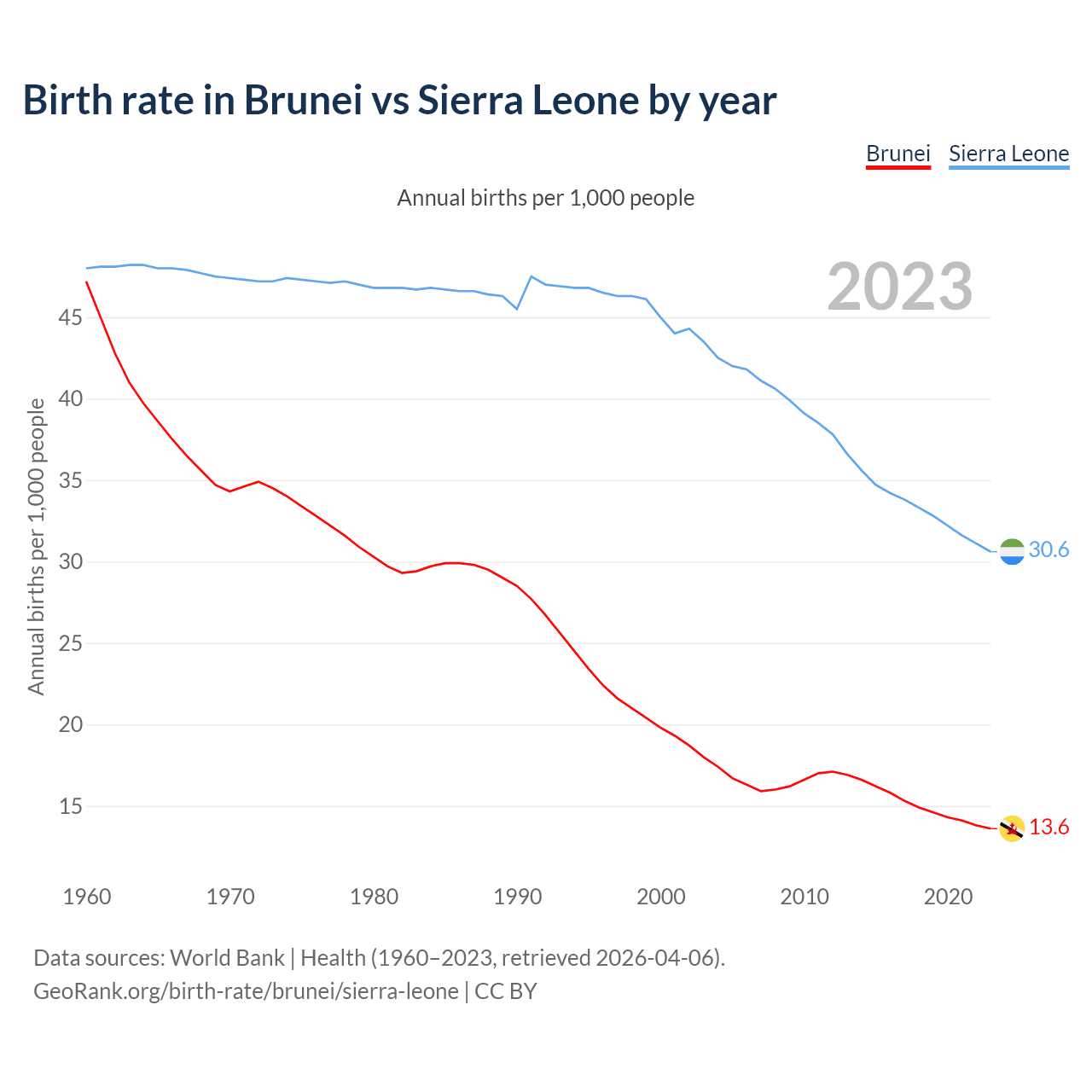 Brunei has an annual birth rate of 13.6 births per 1,000 people, compared to 30.6 for Sierra Leone. The average number of children a woman is expected to have during her lifetime — the fertility rate, is 1.75 in Brunei and 3.79 in Sierra Leone — 117% difference.