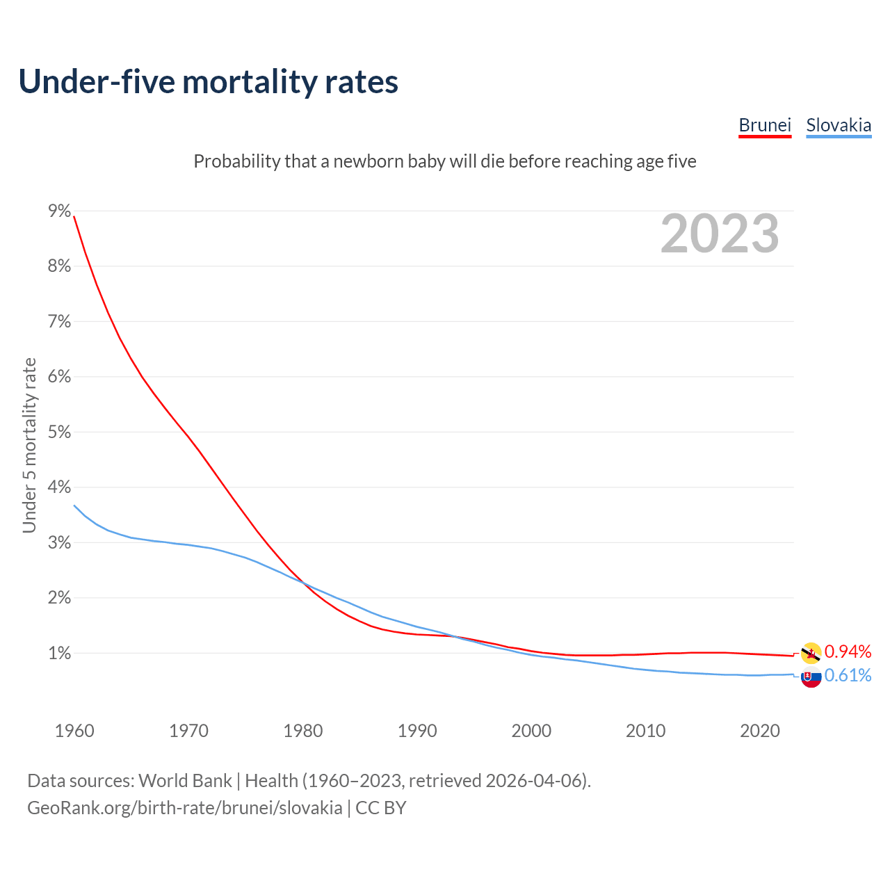 The chance that a newborn baby will die before reaching age five is 0.94% in Brunei and 0.61% in Slovakia. Above is a chart with historical data on under-five mortality rates.