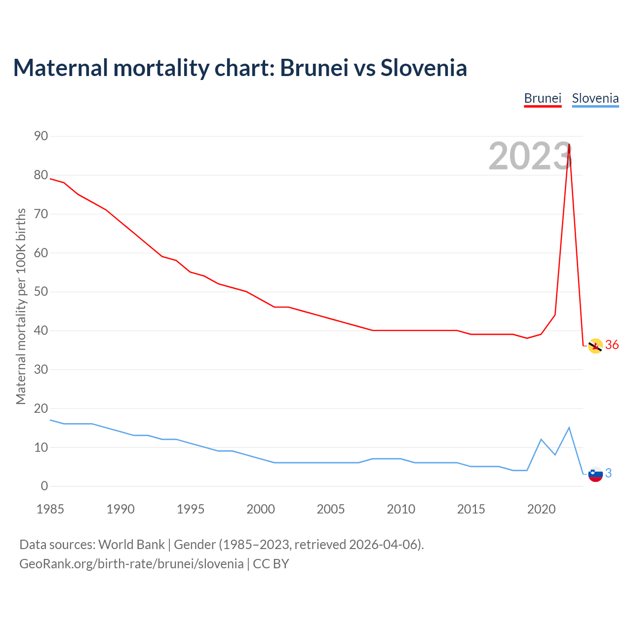 The maternal mortality rate, which is the probability of dying during childbirth or within 42 days of pregnancy termination, is 36 deaths per 100,000 live births in Brunei, compared to 3 deaths in Slovenia.