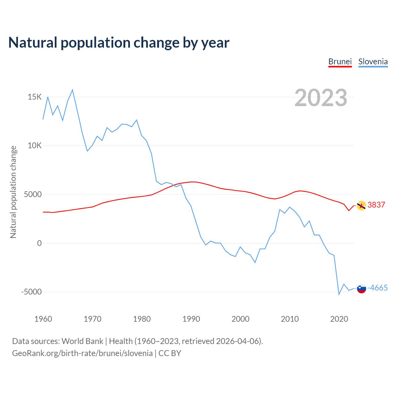 Brunei has an annual birth rate of 13.6 births per 1,000 people, compared to 8 for Slovenia. The average number of children a woman is expected to have during her lifetime — the fertility rate, is 1.75 in Brunei and 1.51 in Slovenia — 13.6% difference.