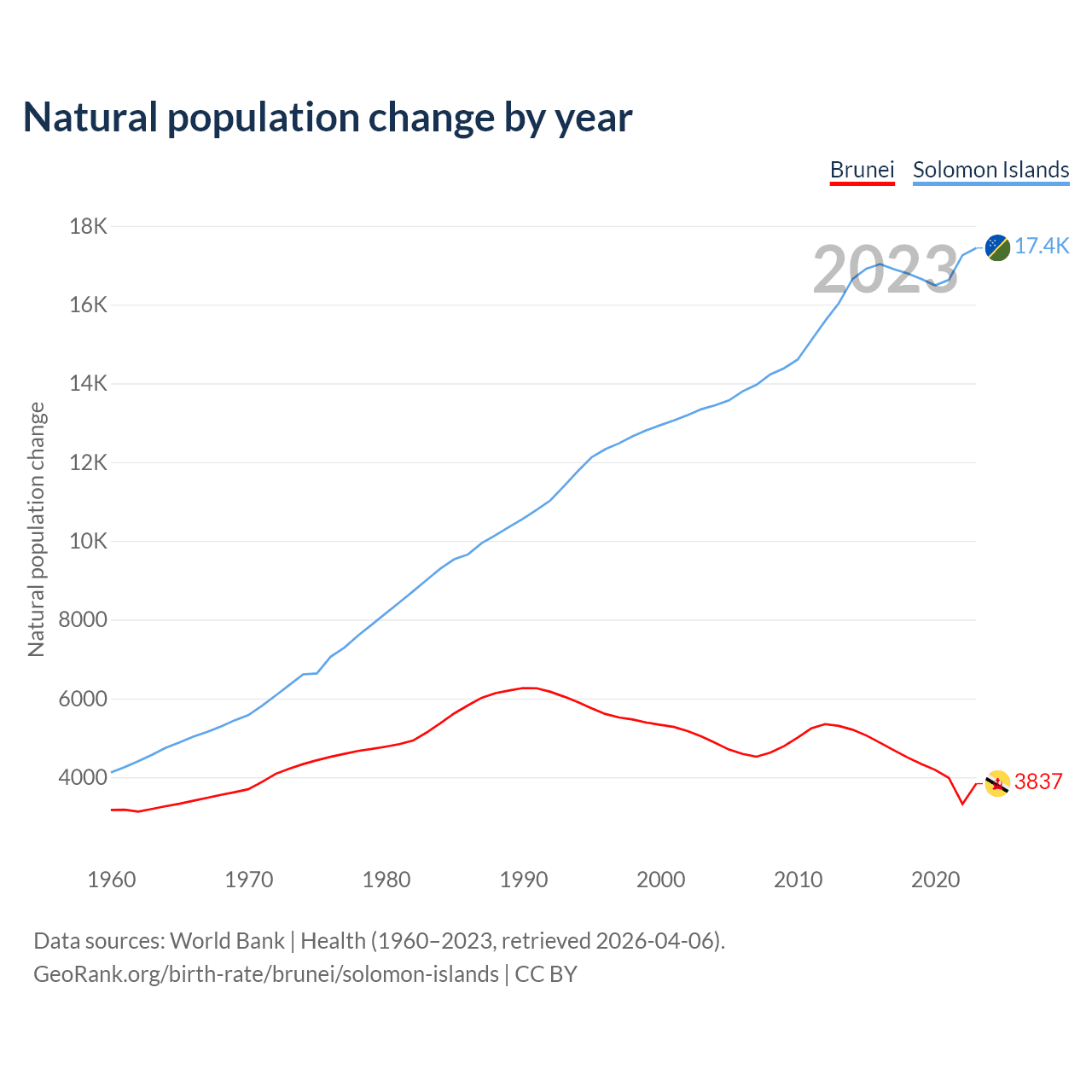 Brunei has an annual birth rate of 13.6 births per 1,000 people, compared to 26.9 for the Solomon Islands. The average number of children a woman is expected to have during her lifetime — the fertility rate, is 1.75 in Brunei and 3.56 in the Solomon Islands — 103.6% difference.