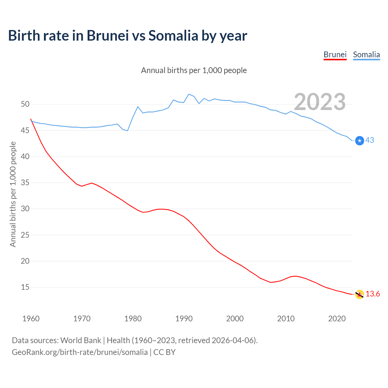 Brunei has an annual birth rate of 13.6 births per 1,000 people, compared to 43 for Somalia. The average number of children a woman is expected to have during her lifetime — the fertility rate, is 1.75 in Brunei and 6.13 in Somalia — 251% difference.
