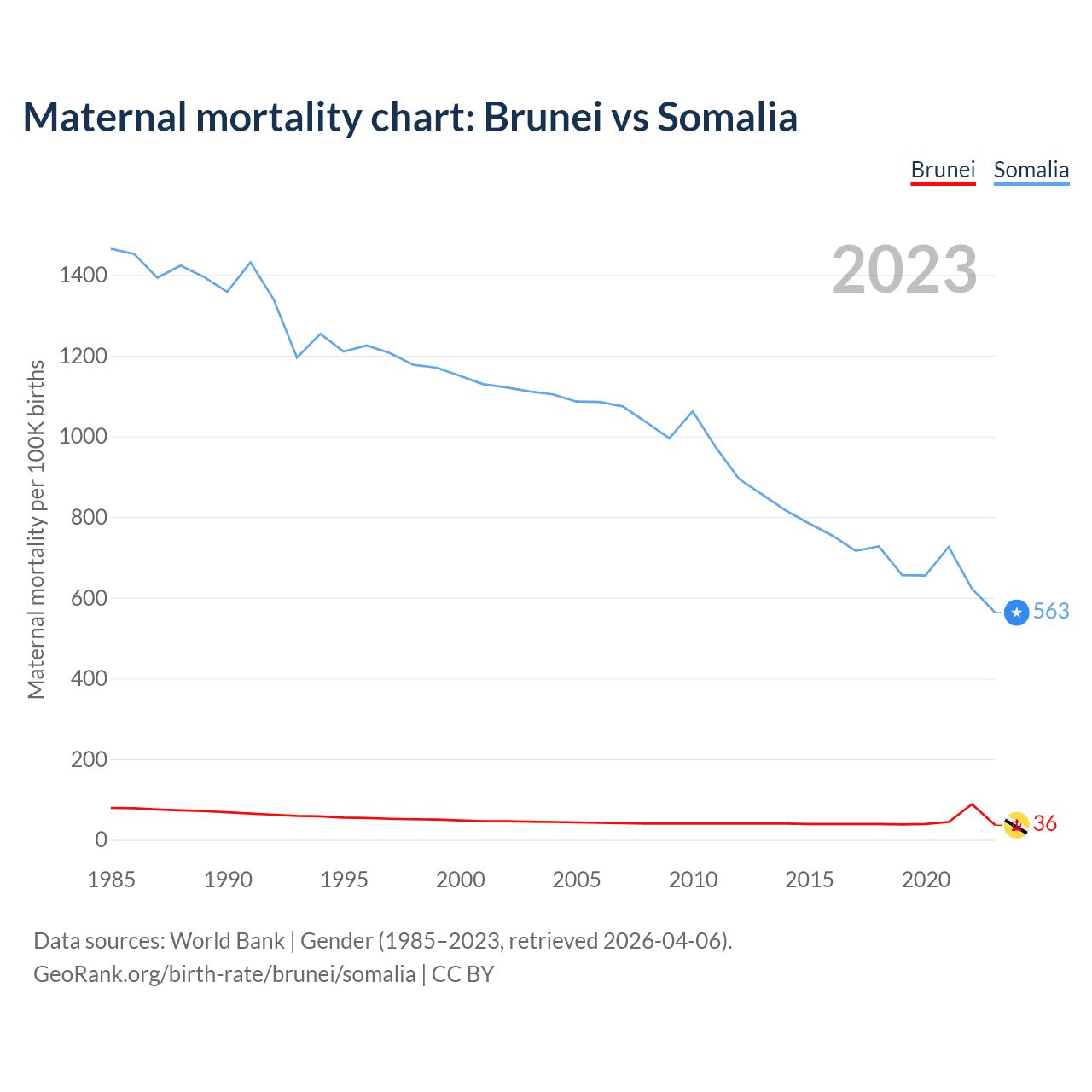 The maternal mortality rate, which is the probability of dying during childbirth or within 42 days of pregnancy termination, is 36 deaths per 100,000 live births in Brunei, compared to 563 deaths in Somalia.