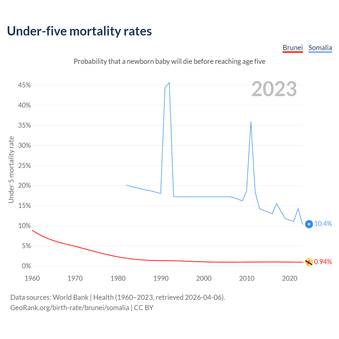 The chance that a newborn baby will die before reaching age five is 0.94% in Brunei and 10.4% in Somalia. Above is a chart with historical data on under-five mortality rates.