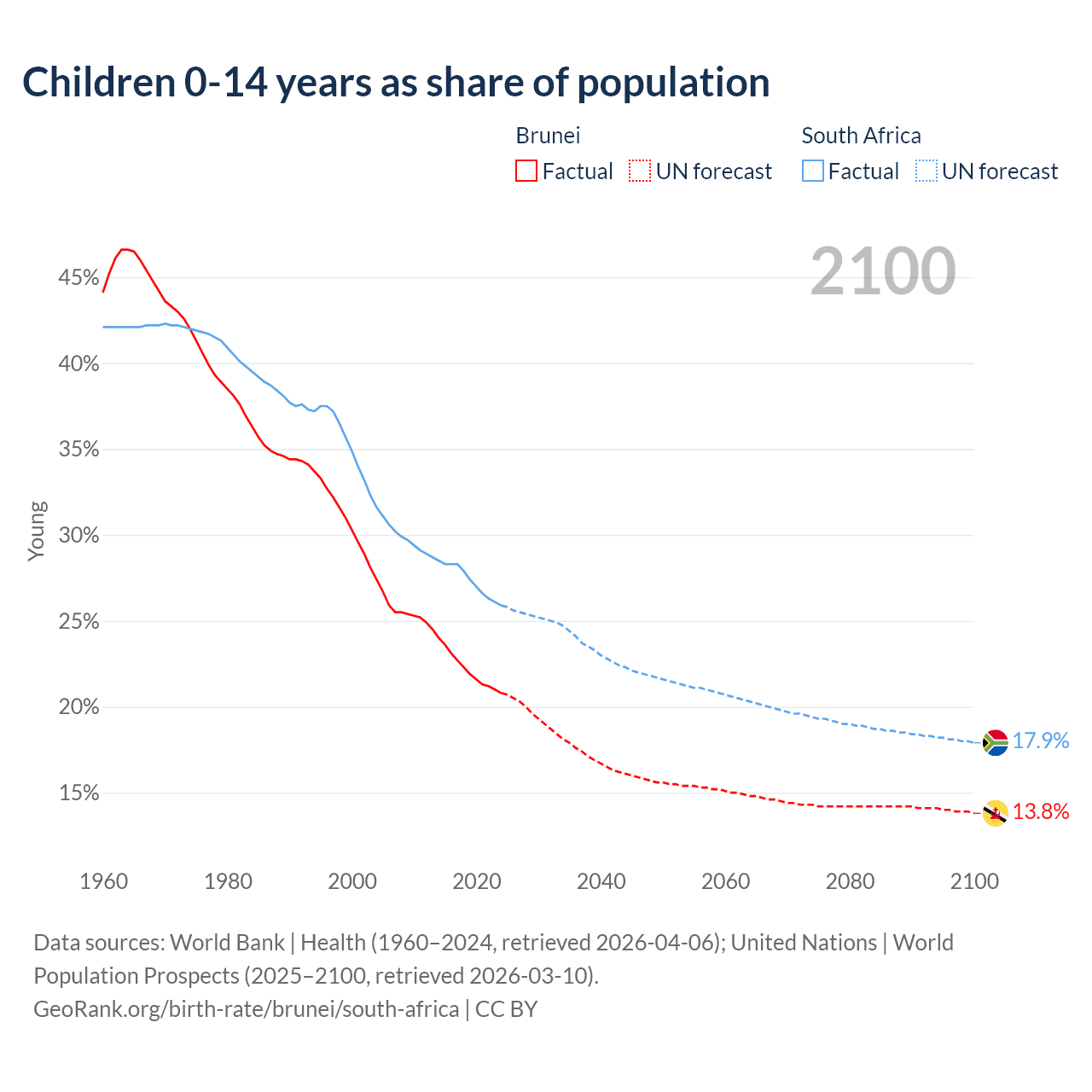 According to the latest available data on birth rates, the fertility rate in Brunei was 1.75 children per woman in 2023, compared to 2.22 in South Africa in 2023. The replacement level is considered to be 2.1 children per woman.