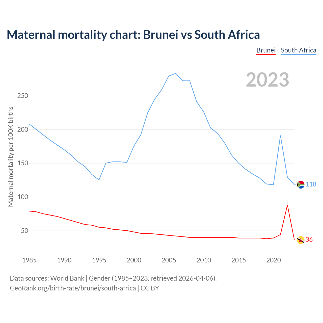 The maternal mortality rate, which is the probability of dying during childbirth or within 42 days of pregnancy termination, is 36 deaths per 100,000 live births in Brunei, compared to 118 deaths in South Africa.