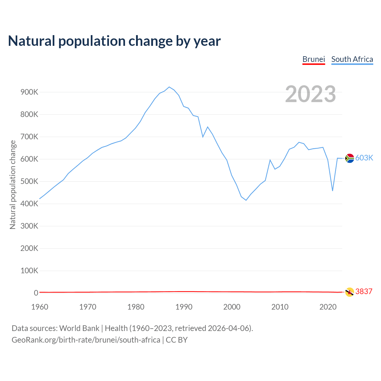 Brunei has an annual birth rate of 13.6 births per 1,000 people, compared to 18.8 for South Africa. The average number of children a woman is expected to have during her lifetime — the fertility rate, is 1.75 in Brunei and 2.22 in South Africa — 26.8% difference.