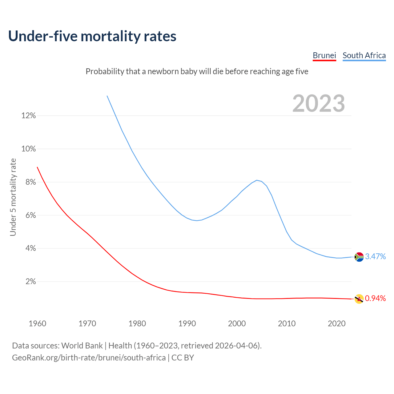 The chance that a newborn baby will die before reaching age five is 0.94% in Brunei and 3.47% in South Africa. Above is a chart with historical data on under-five mortality rates.