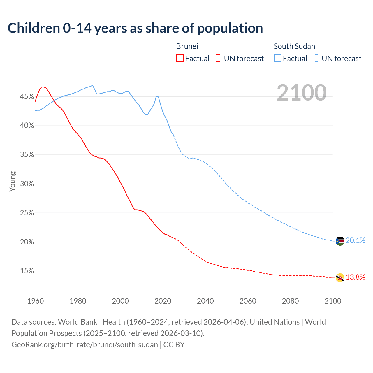 Brunei has an annual birth rate of 13.6 births per 1,000 people, compared to 28.6 for South Sudan. The average number of children a woman is expected to have during her lifetime — the fertility rate, is 1.75 in Brunei and 3.86 in South Sudan — 121.2% difference.