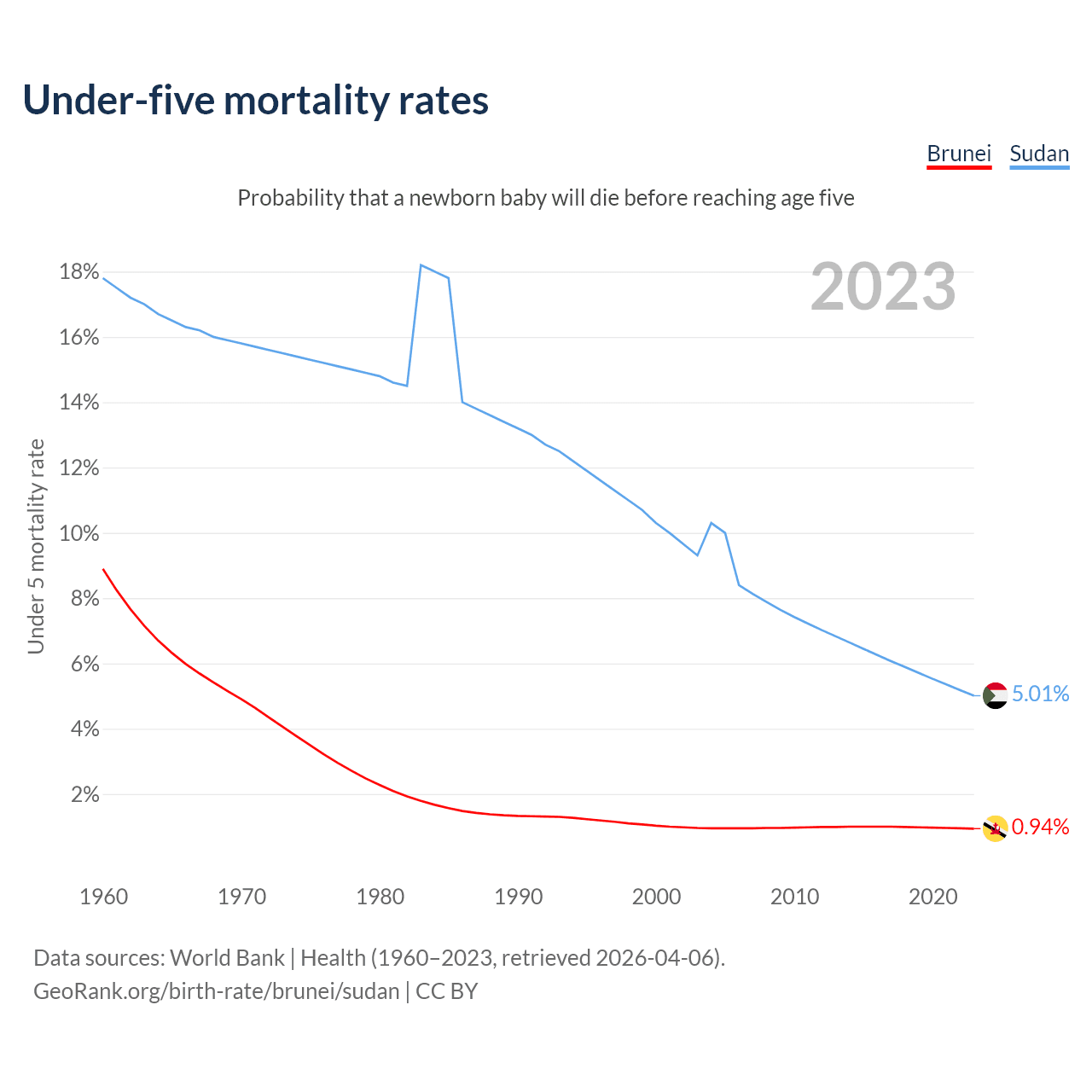 The chance that a newborn baby will die before reaching age five is 0.94% in Brunei and 5.01% in Sudan. Above is a chart with historical data on under-five mortality rates.