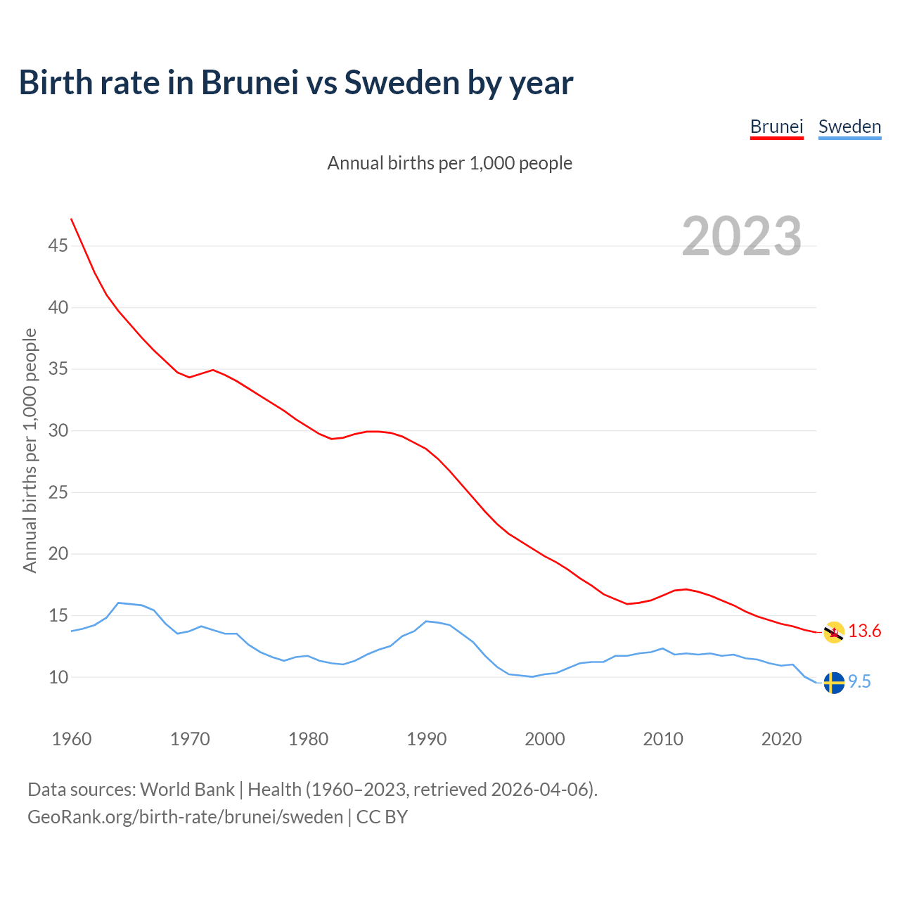 Brunei has an annual birth rate of 13.6 births per 1,000 people, compared to 9.5 for Sweden. The average number of children a woman is expected to have during her lifetime — the fertility rate, is 1.75 in Brunei and 1.45 in Sweden — 17% difference.