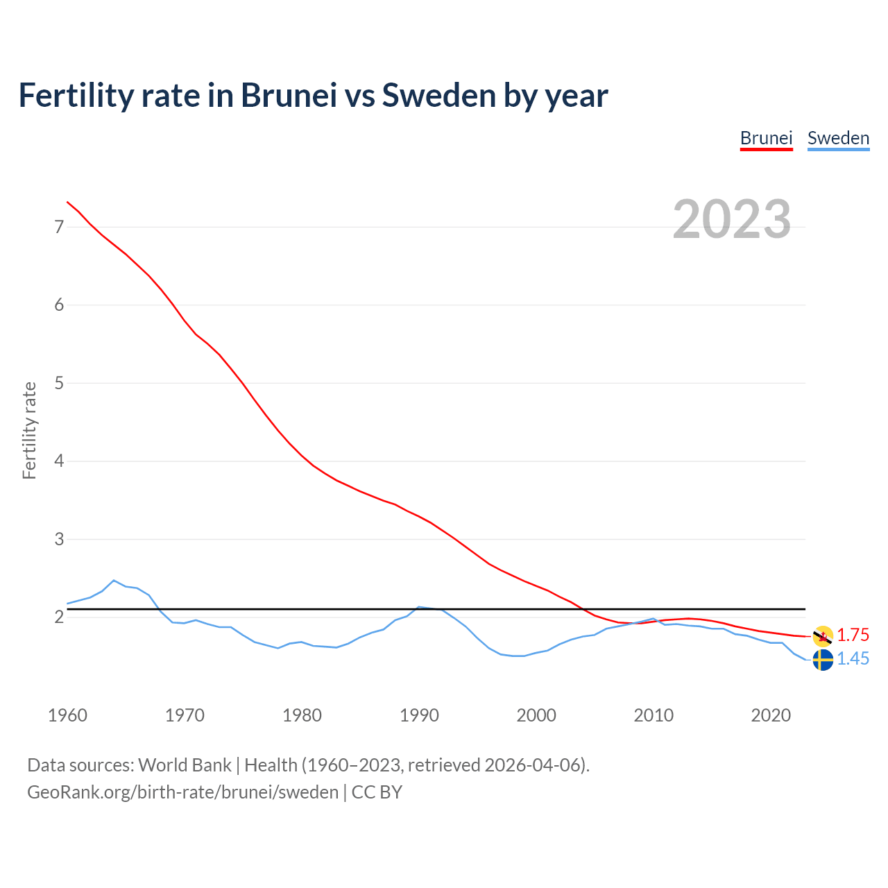 According to the latest available data on birth rates, the fertility rate in Brunei was 1.75 children per woman in 2023, compared to 1.45 in Sweden in 2023. The replacement level is considered to be 2.1 children per woman.