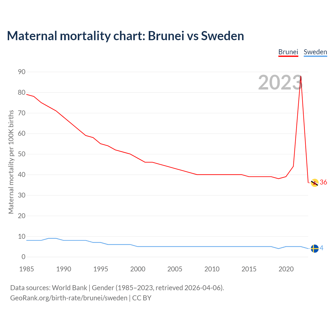 The maternal mortality rate, which is the probability of dying during childbirth or within 42 days of pregnancy termination, is 36 deaths per 100,000 live births in Brunei, compared to 4 deaths in Sweden.