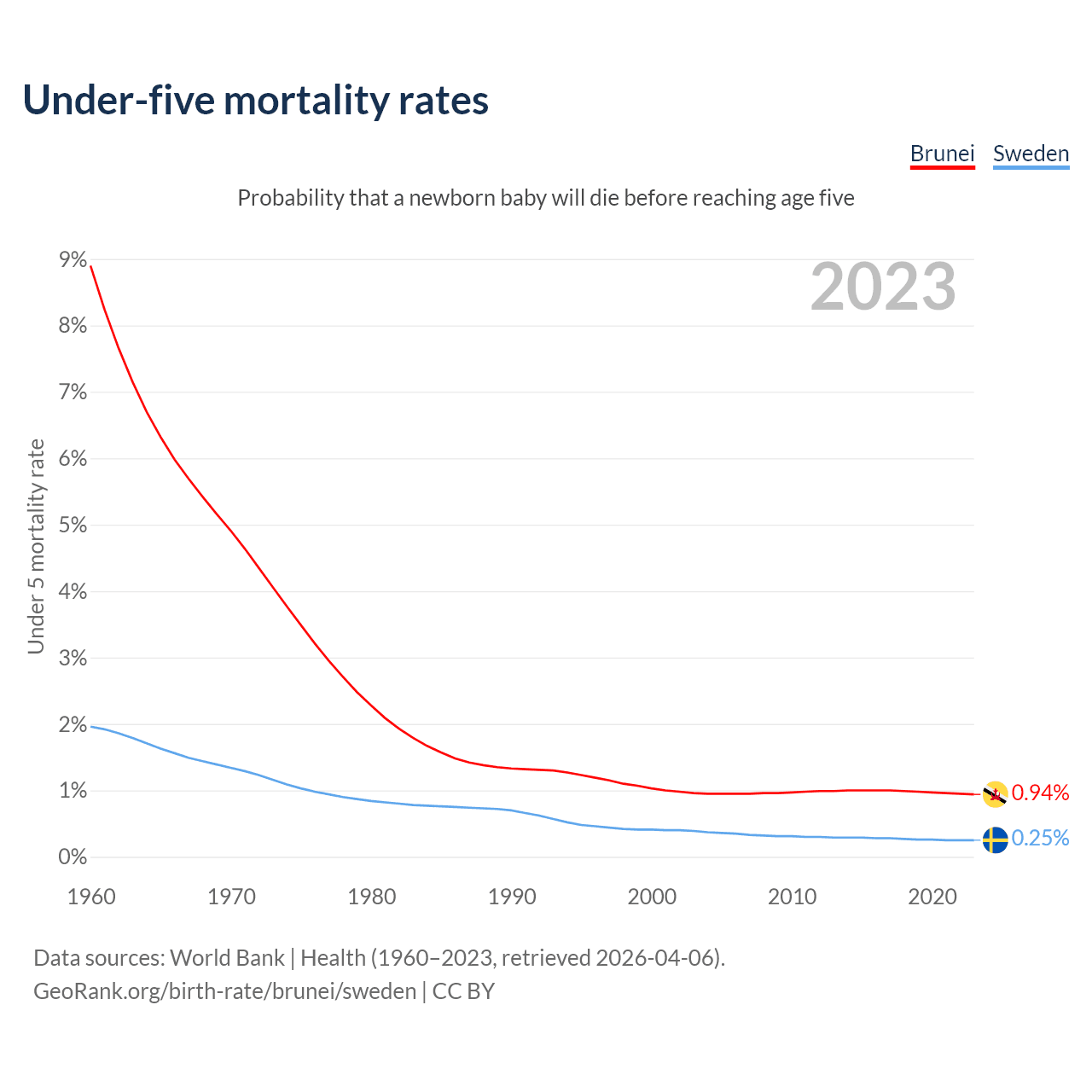 The chance that a newborn baby will die before reaching age five is 0.94% in Brunei and 0.25% in Sweden. Above is a chart with historical data on under-five mortality rates.