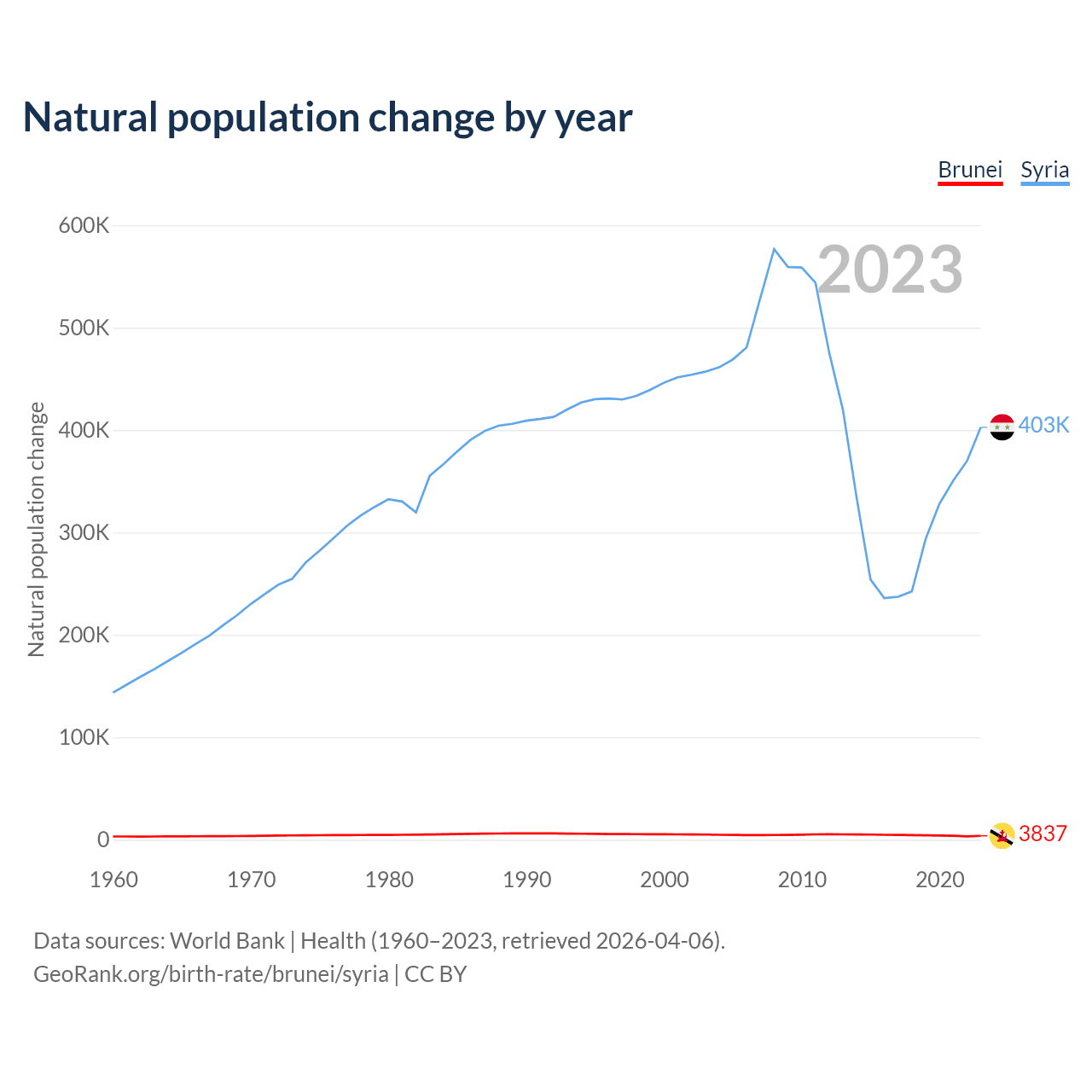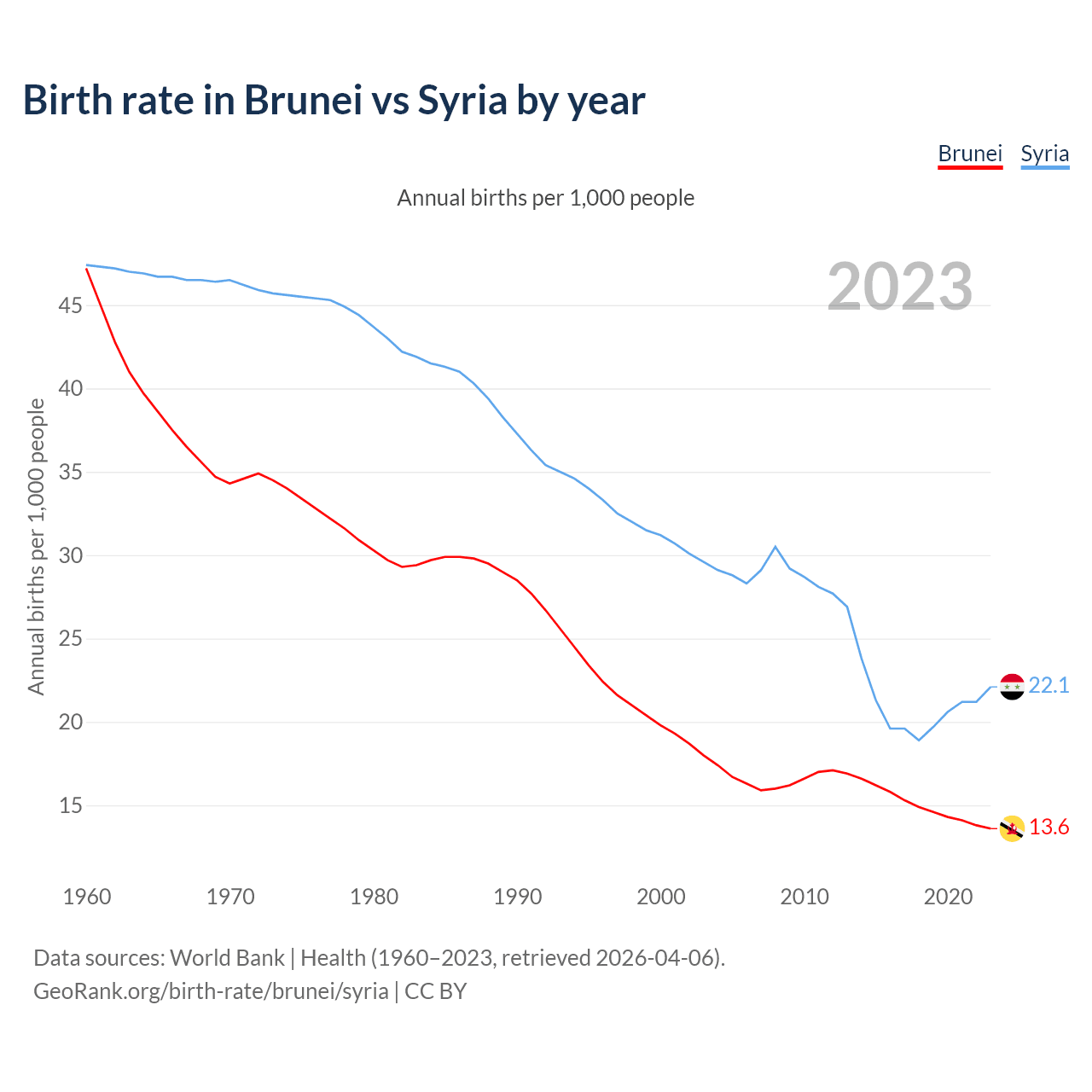 Brunei has an annual birth rate of 13.6 births per 1,000 people, compared to 22.1 for Syria. The average number of children a woman is expected to have during her lifetime — the fertility rate, is 1.75 in Brunei and 2.71 in Syria — 55.2% difference.