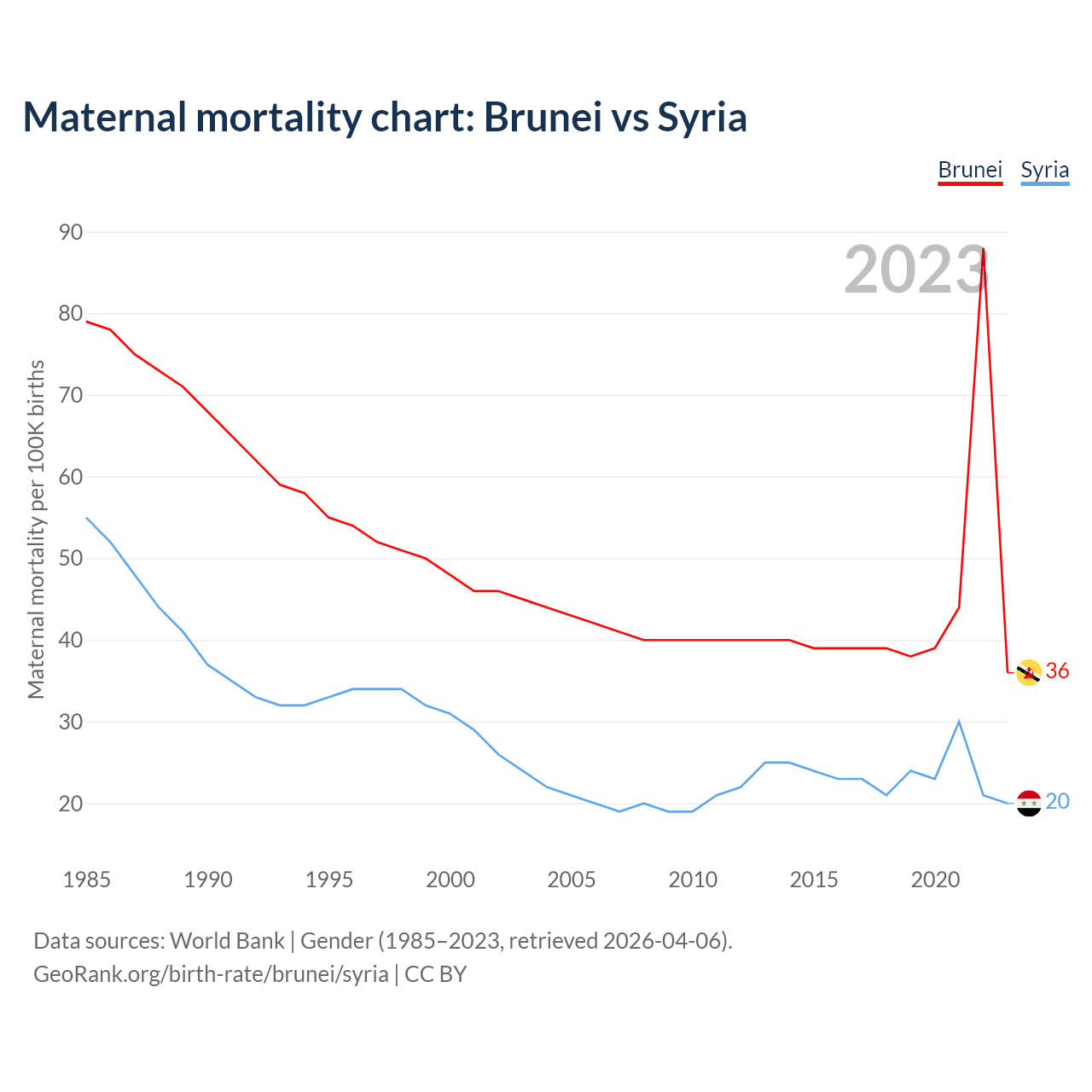 The maternal mortality rate, which is the probability of dying during childbirth or within 42 days of pregnancy termination, is 36 deaths per 100,000 live births in Brunei, compared to 20 deaths in Syria.