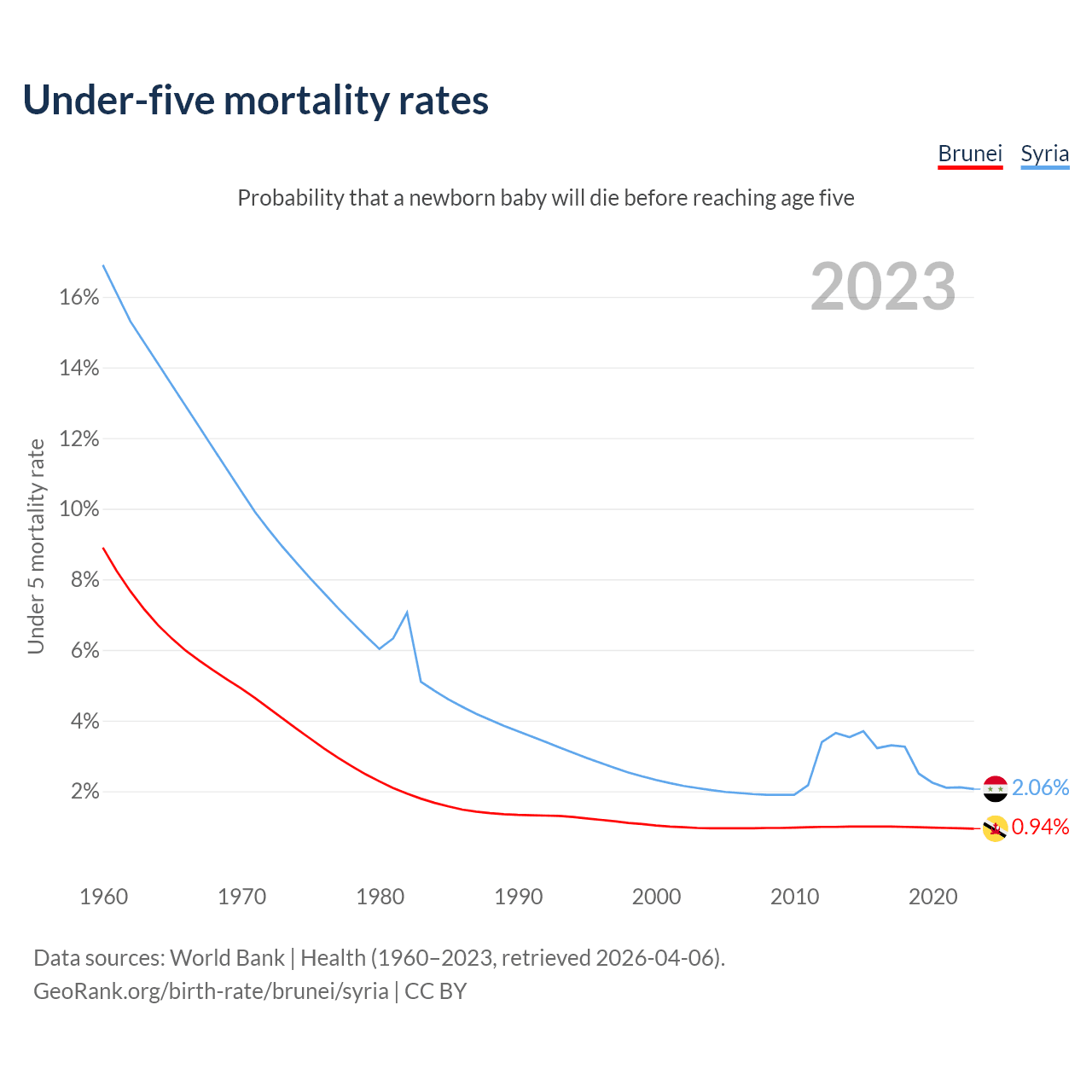 The chance that a newborn baby will die before reaching age five is 0.94% in Brunei and 2.06% in Syria. Above is a chart with historical data on under-five mortality rates.