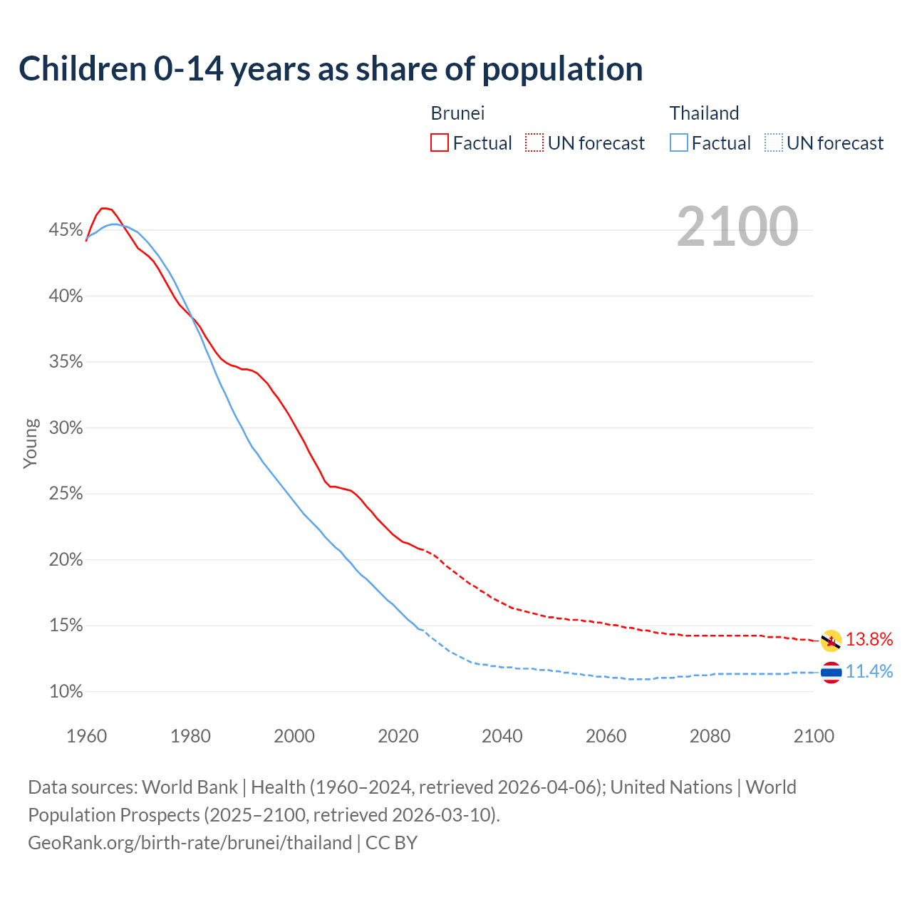 According to the latest available data on birth rates, the fertility rate in Brunei was 1.75 children per woman in 2023, compared to 1.21 in Thailand in 2023. The replacement level is considered to be 2.1 children per woman.