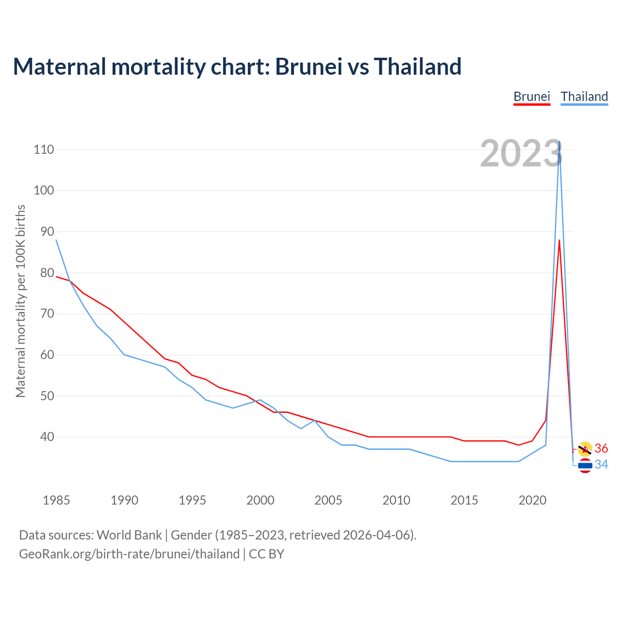 The maternal mortality rate, which is the probability of dying during childbirth or within 42 days of pregnancy termination, is 36 deaths per 100,000 live births in Brunei, compared to 34 deaths in Thailand.