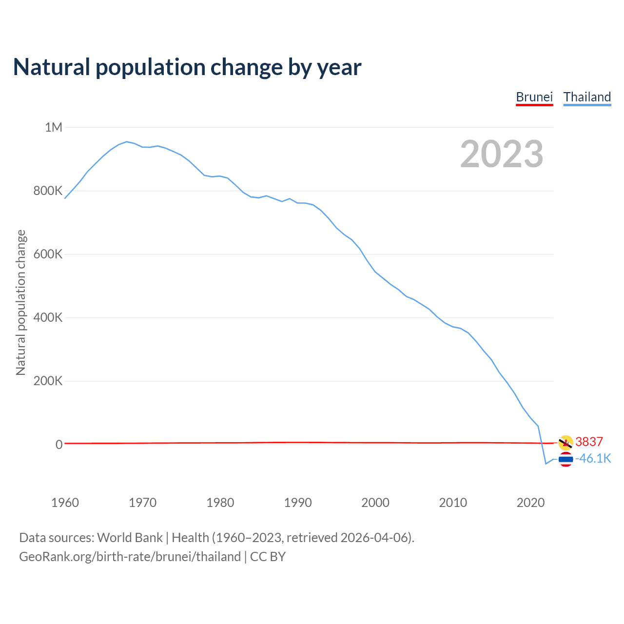 Brunei has an annual birth rate of 13.6 births per 1,000 people, compared to 8.24 for Thailand. The average number of children a woman is expected to have during her lifetime — the fertility rate, is 1.75 in Brunei and 1.21 in Thailand — 30.6% difference.