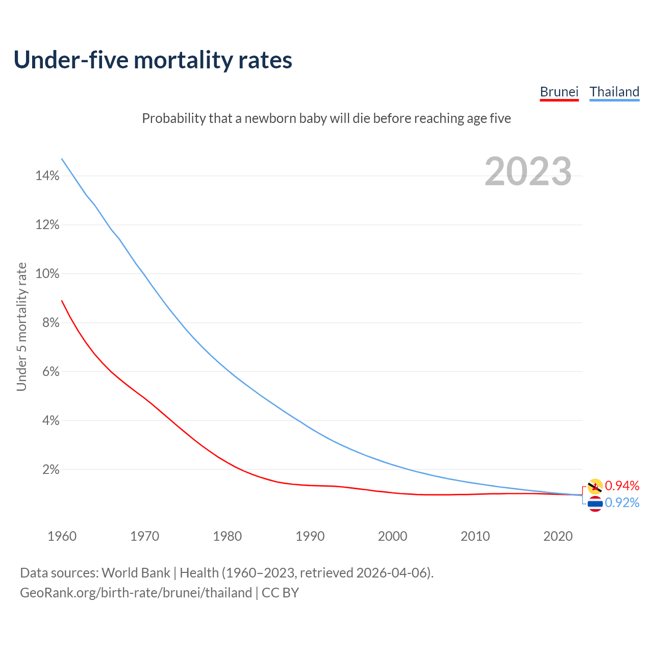 The chance that a newborn baby will die before reaching age five is 0.94% in Brunei and 0.92% in Thailand. Above is a chart with historical data on under-five mortality rates.