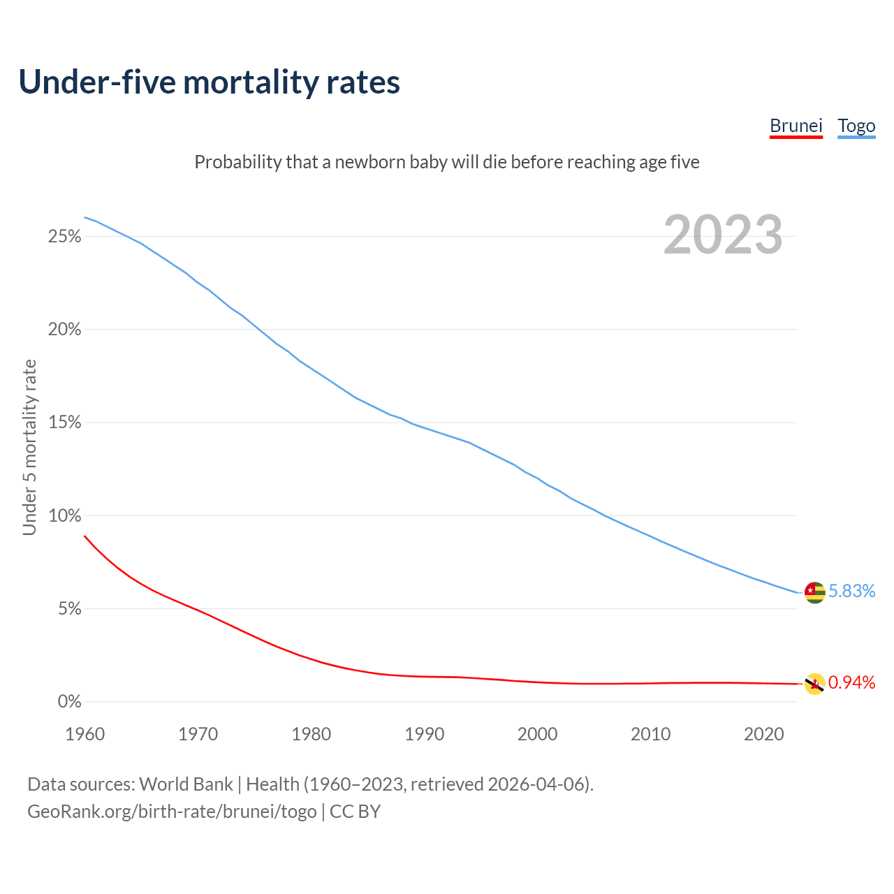 The chance that a newborn baby will die before reaching age five is 0.94% in Brunei and 5.83% in Togo. Above is a chart with historical data on under-five mortality rates.
