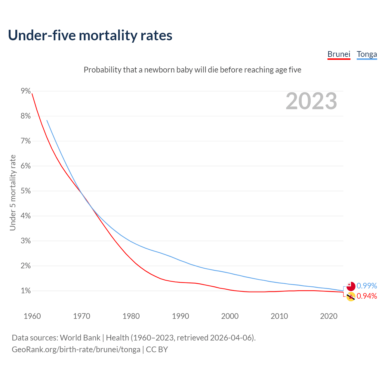 The chance that a newborn baby will die before reaching age five is 0.94% in Brunei and 0.99% in Tonga. Above is a chart with historical data on under-five mortality rates.