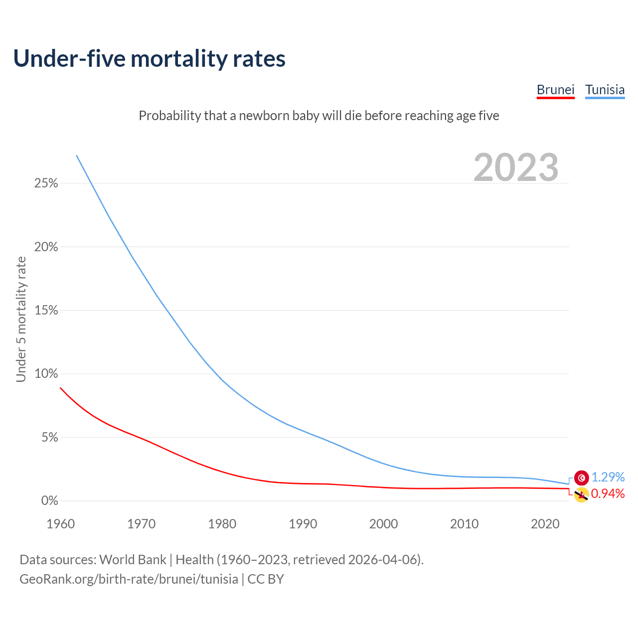 The chance that a newborn baby will die before reaching age five is 0.94% in Brunei and 1.29% in Tunisia. Above is a chart with historical data on under-five mortality rates.