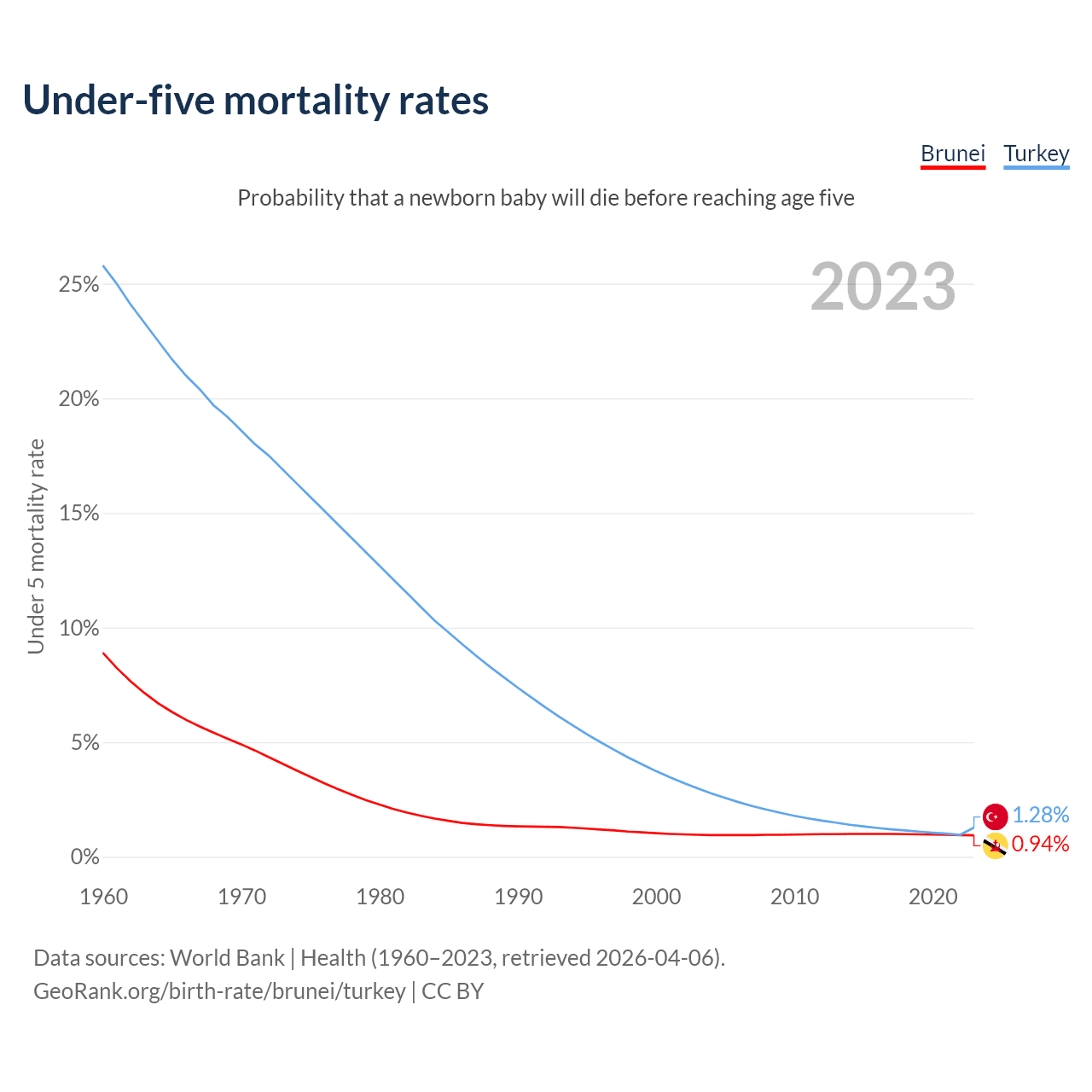 The chance that a newborn baby will die before reaching age five is 0.94% in Brunei and 1.28% in Turkey. Above is a chart with historical data on under-five mortality rates.