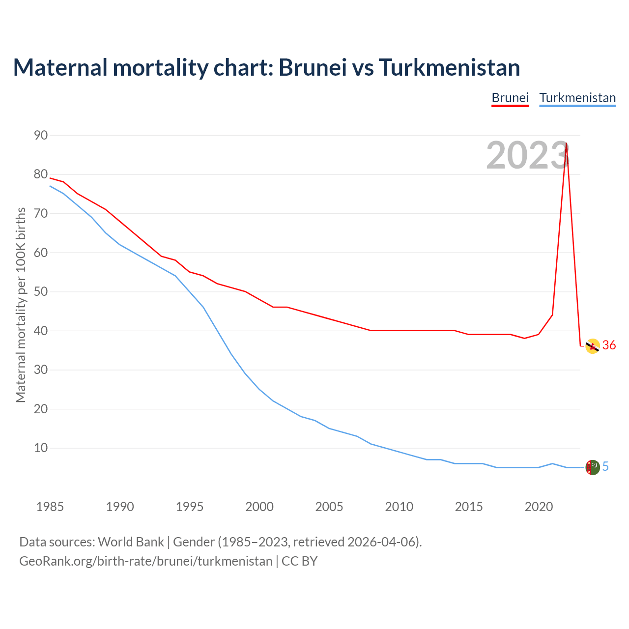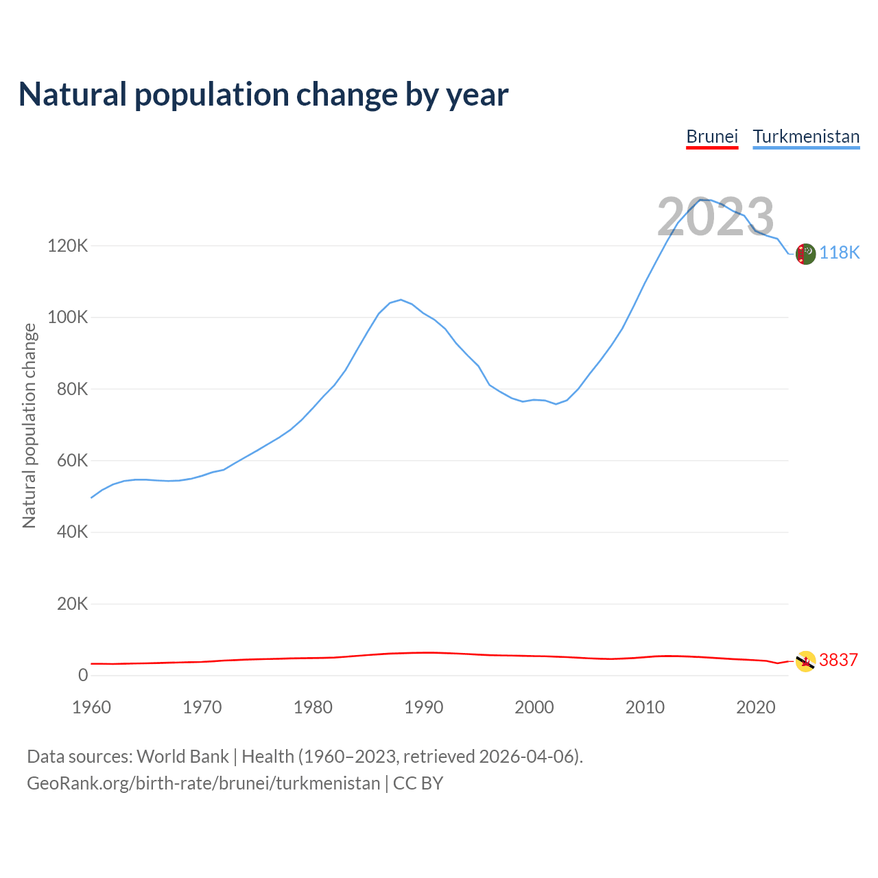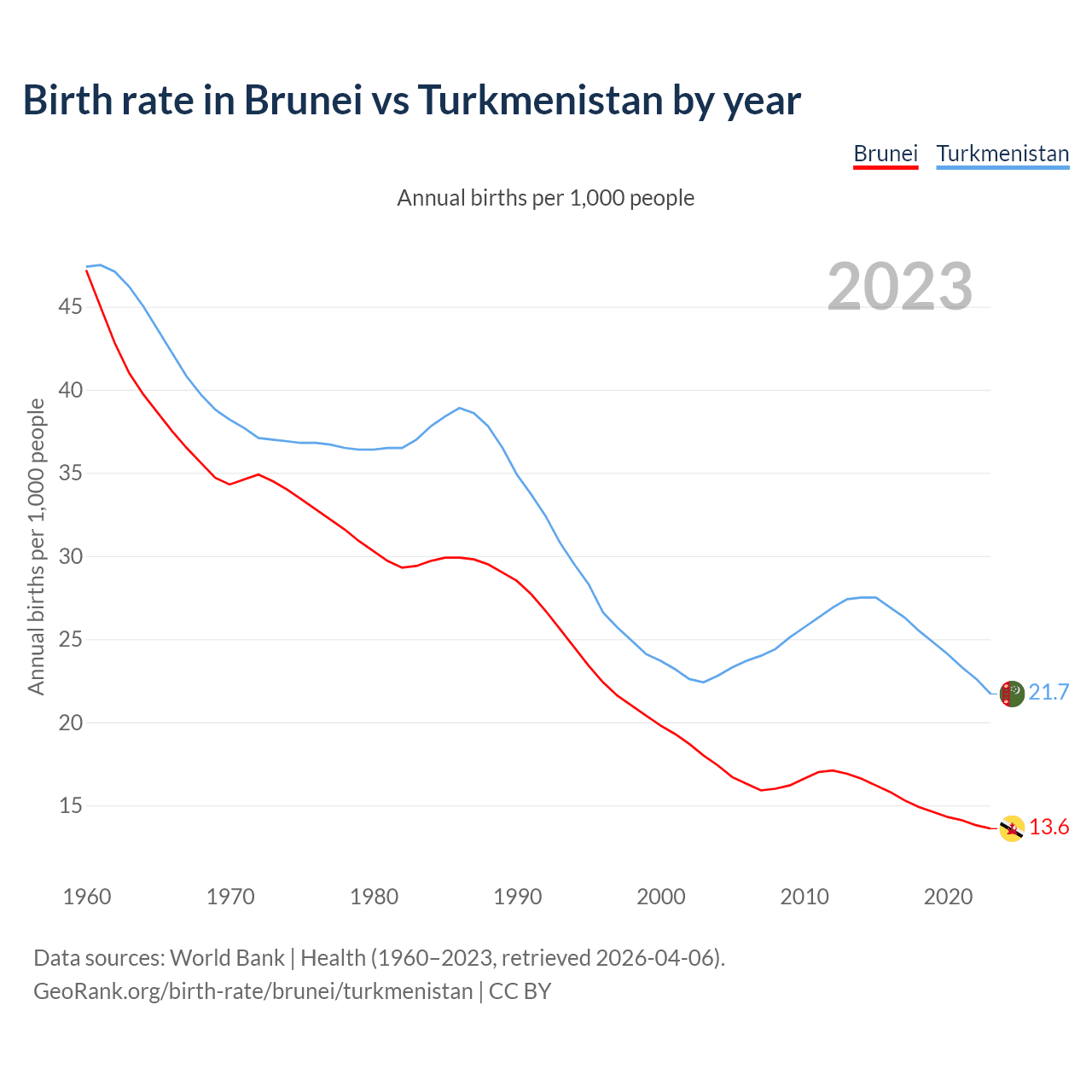 Brunei has an annual birth rate of 13.6 births per 1,000 people, compared to 21.7 for Turkmenistan. The average number of children a woman is expected to have during her lifetime — the fertility rate, is 1.75 in Brunei and 2.69 in Turkmenistan — 54% difference.