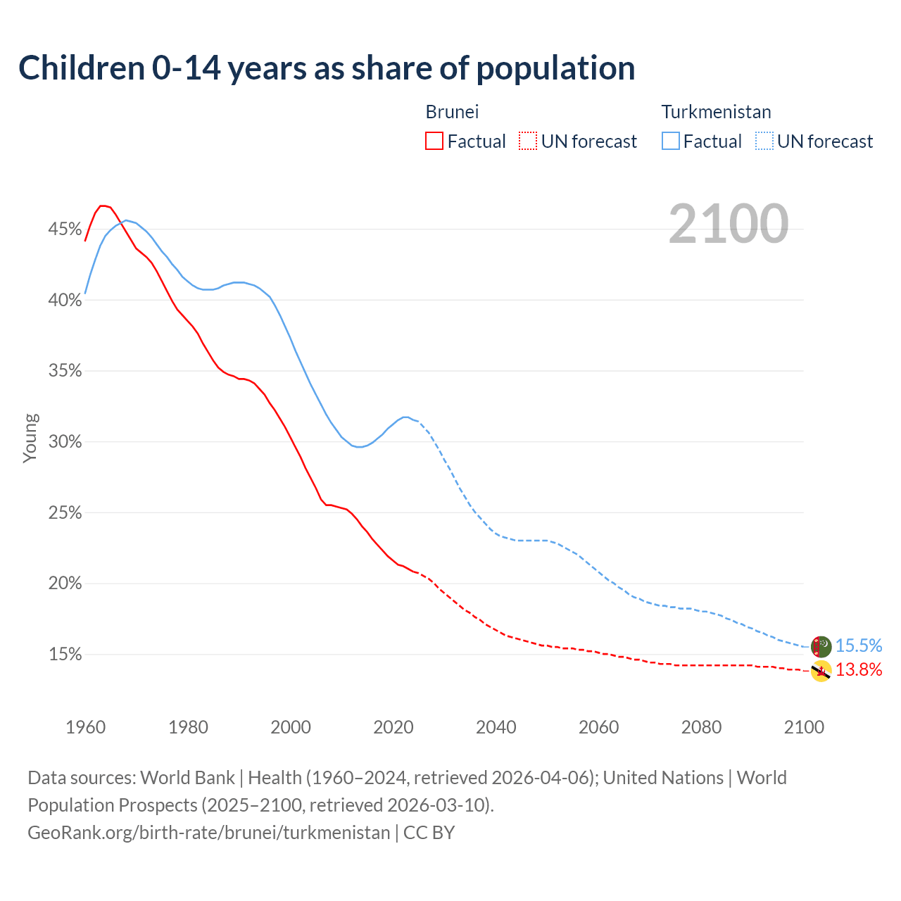 According to the latest available data on birth rates, the fertility rate in Brunei was 1.75 children per woman in 2023, compared to 2.69 in Turkmenistan in 2023. The replacement level is considered to be 2.1 children per woman.