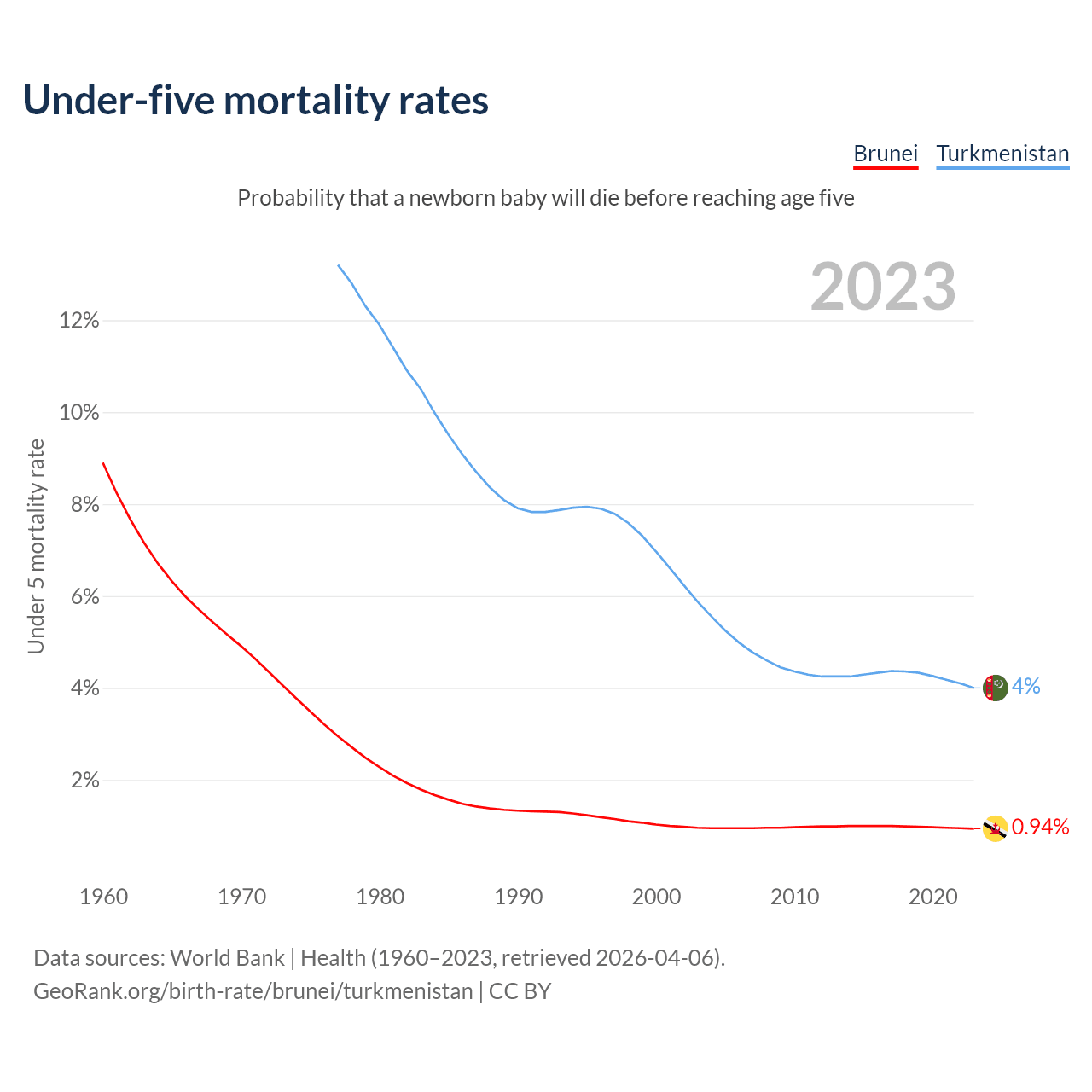 The chance that a newborn baby will die before reaching age five is 0.94% in Brunei and 4% in Turkmenistan. Above is a chart with historical data on under-five mortality rates.