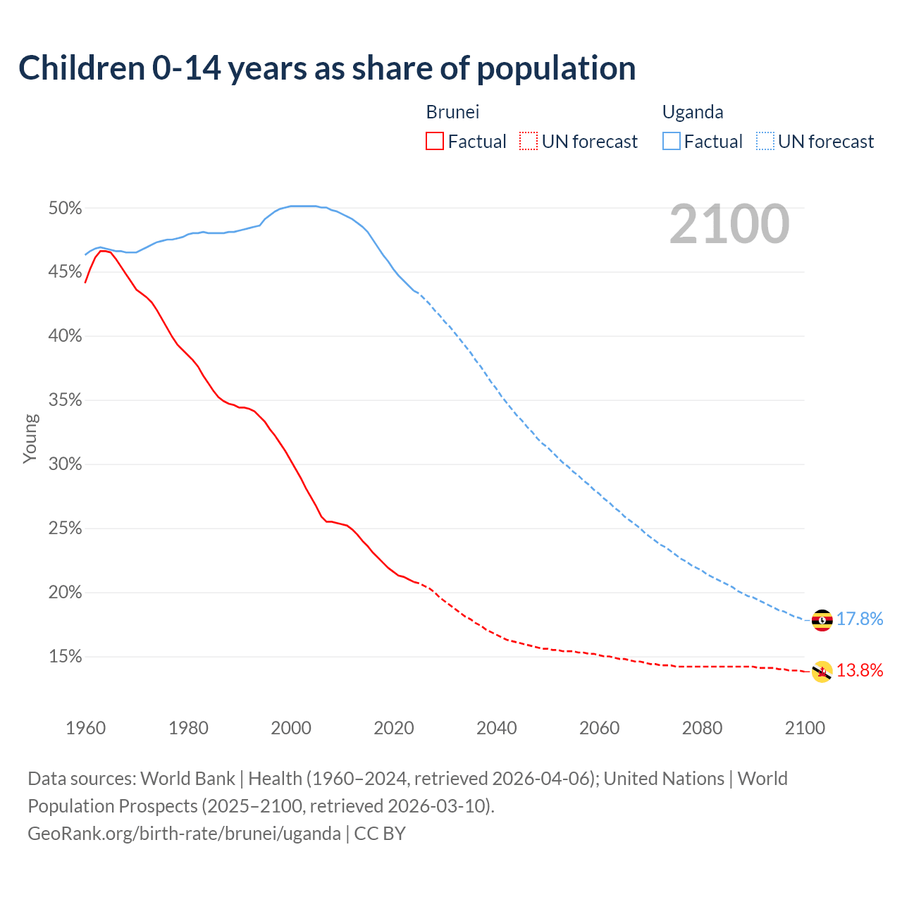 According to the latest available data on birth rates, the fertility rate in Brunei was 1.75 children per woman in 2023, compared to 4.28 in Uganda in 2023. The replacement level is considered to be 2.1 children per woman.