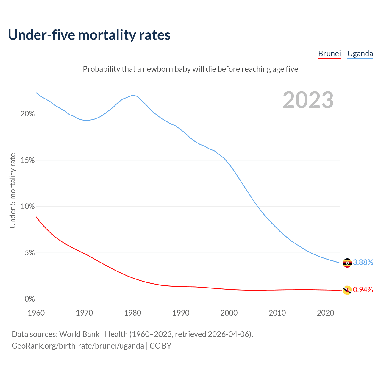 The chance that a newborn baby will die before reaching age five is 0.94% in Brunei and 3.88% in Uganda. Above is a chart with historical data on under-five mortality rates.