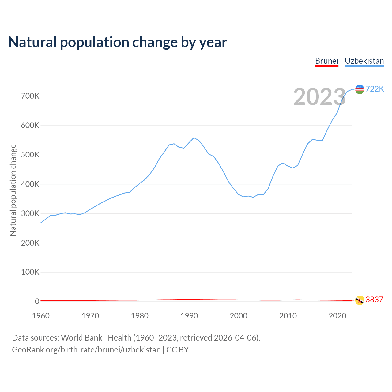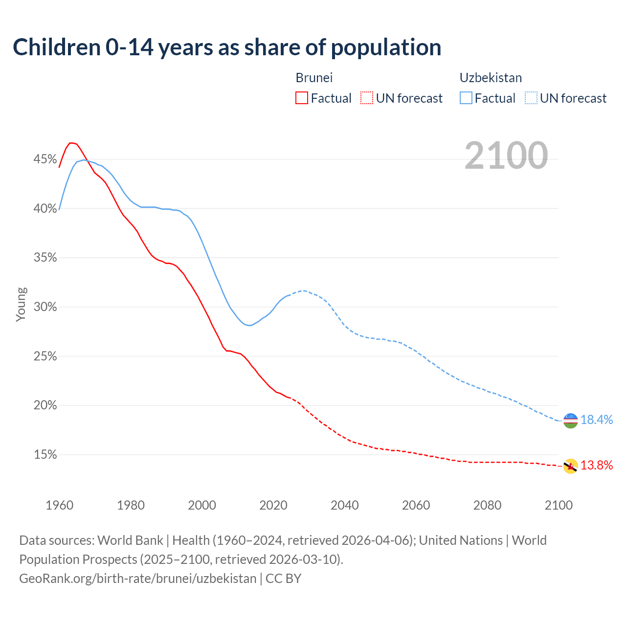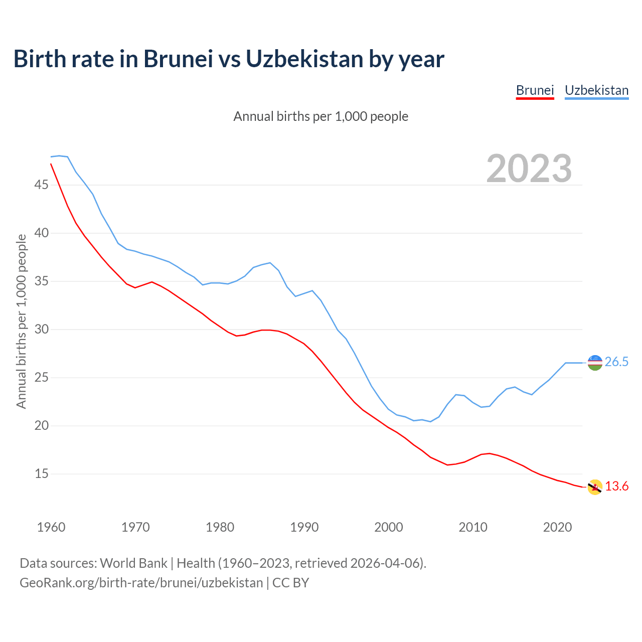 Brunei has an annual birth rate of 13.6 births per 1,000 people, compared to 26.5 for Uzbekistan. The average number of children a woman is expected to have during her lifetime — the fertility rate, is 1.75 in Brunei and 3.5 in Uzbekistan — 100.3% difference.