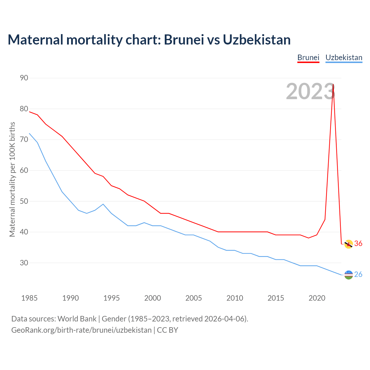 The maternal mortality rate, which is the probability of dying during childbirth or within 42 days of pregnancy termination, is 36 deaths per 100,000 live births in Brunei, compared to 26 deaths in Uzbekistan.