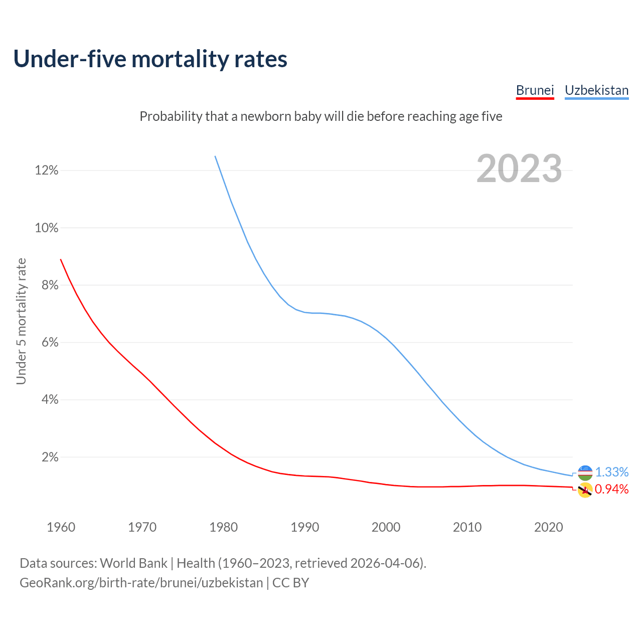 The chance that a newborn baby will die before reaching age five is 0.94% in Brunei and 1.33% in Uzbekistan. Above is a chart with historical data on under-five mortality rates.