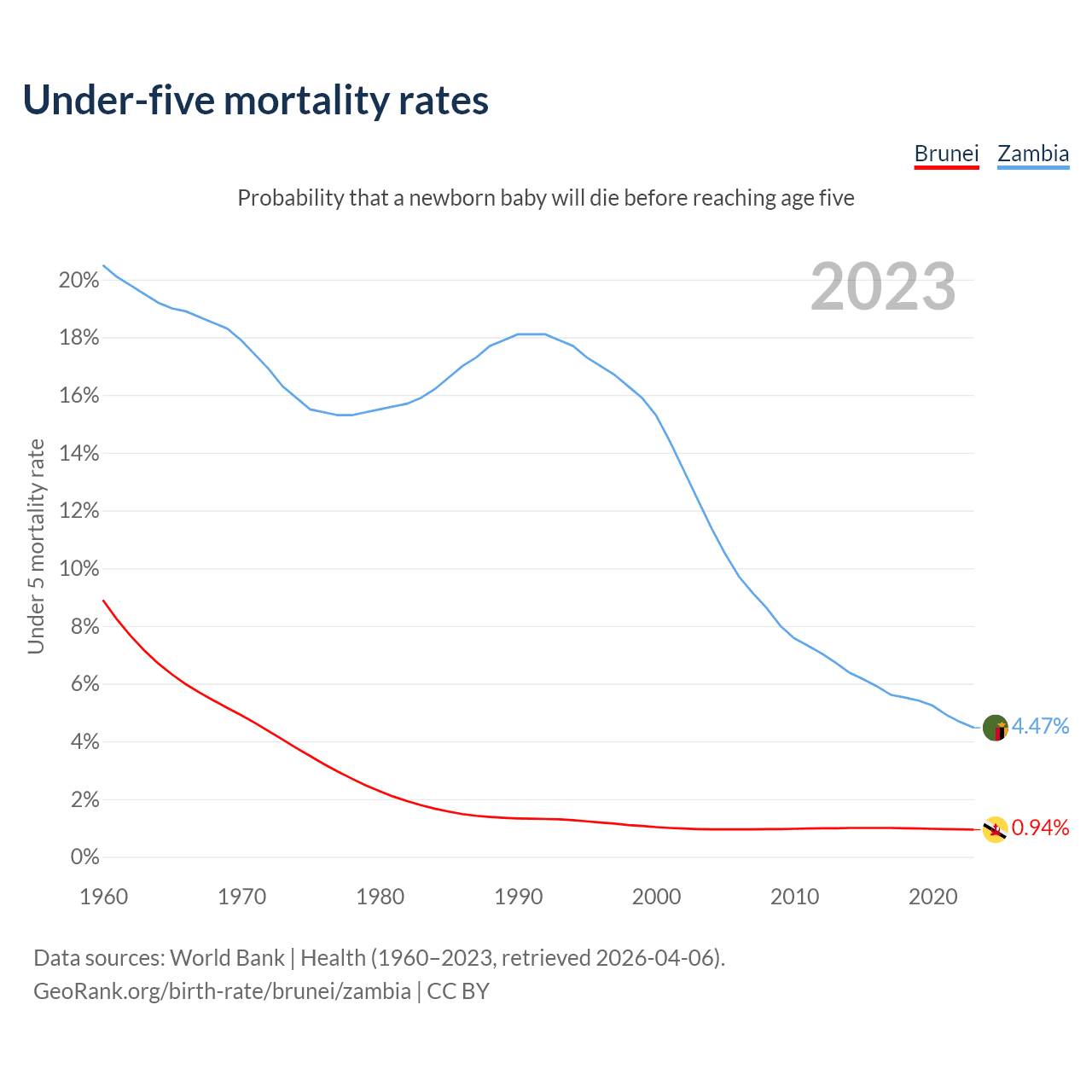 The chance that a newborn baby will die before reaching age five is 0.94% in Brunei and 4.47% in Zambia. Above is a chart with historical data on under-five mortality rates.