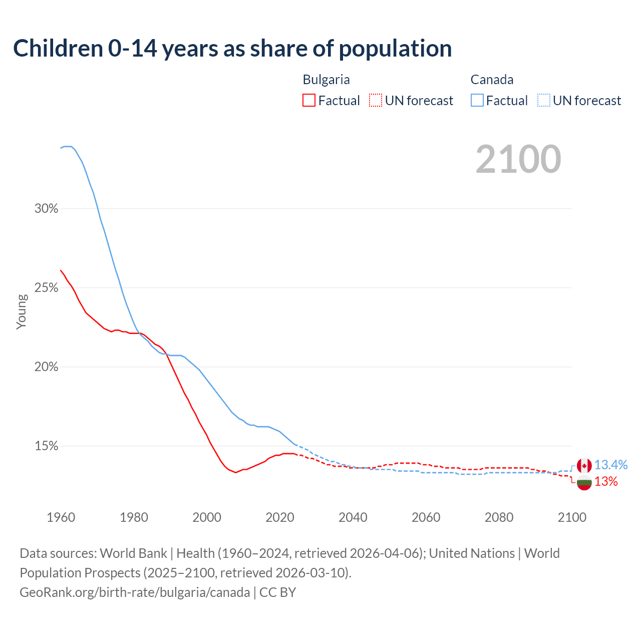 According to the latest available data on birth rates, the fertility rate in Bulgaria was 1.81 children per woman in 2023, compared to 1.26 in Canada in 2023. The replacement level is considered to be 2.1 children per woman.
