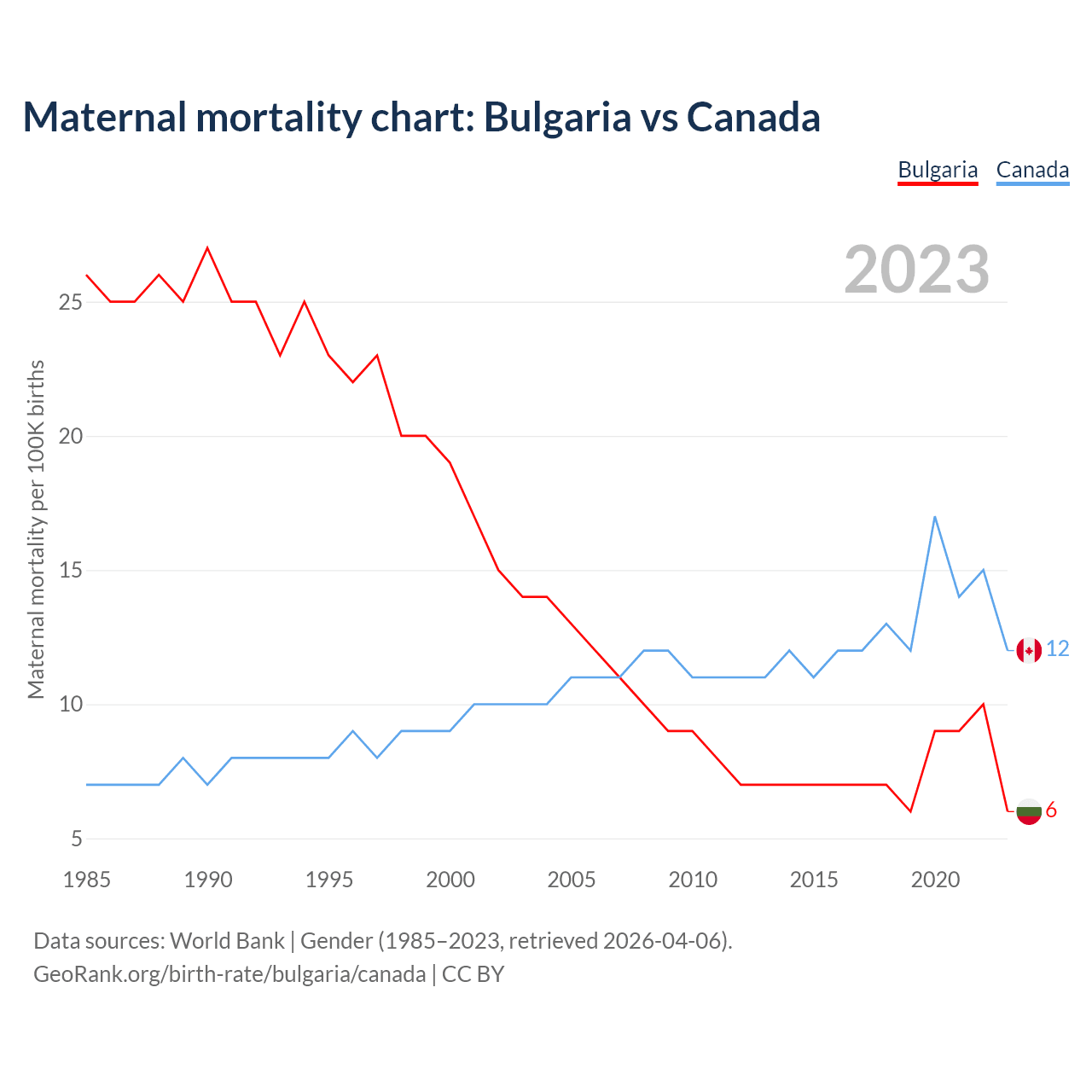 The maternal mortality rate, which is the probability of dying during childbirth or within 42 days of pregnancy termination, is 6 deaths per 100,000 live births in Bulgaria, compared to 12 deaths in Canada.