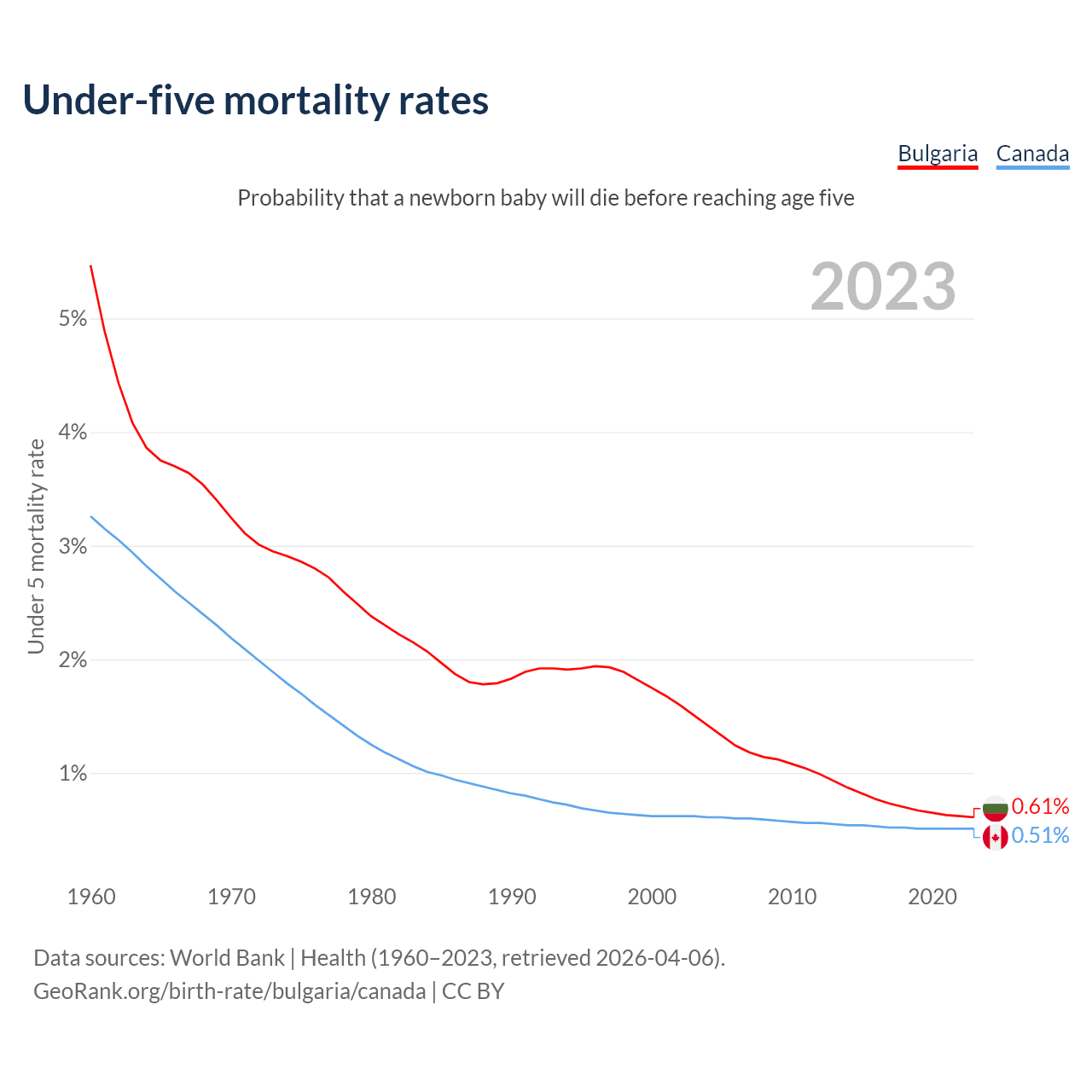 The chance that a newborn baby will die before reaching age five is 0.61% in Bulgaria and 0.51% in Canada. Above is a chart with historical data on under-five mortality rates.