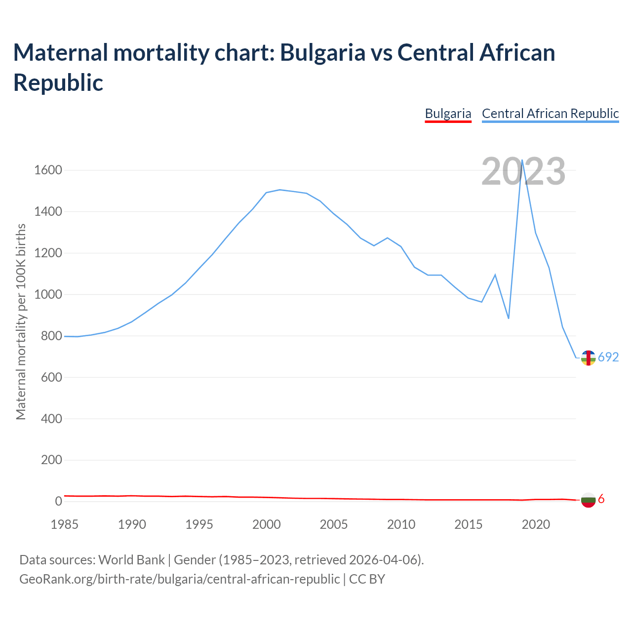 The maternal mortality rate, which is the probability of dying during childbirth or within 42 days of pregnancy termination, is 6 deaths per 100,000 live births in Bulgaria, compared to 692 deaths in the Central African Republic.