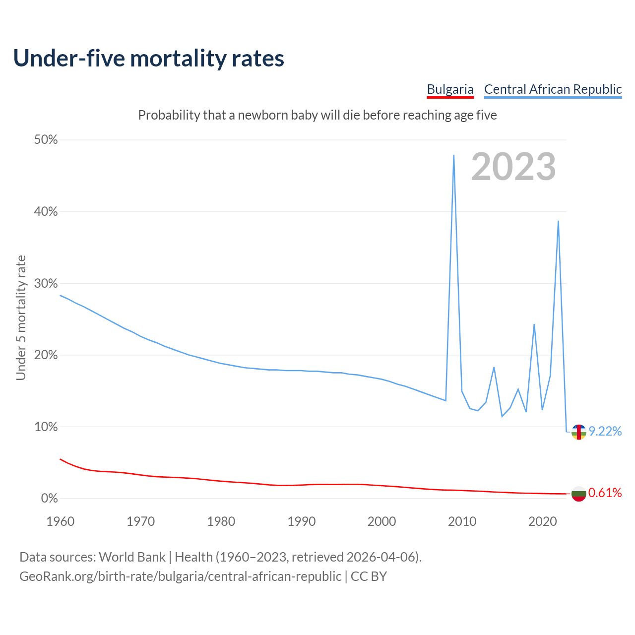 The chance that a newborn baby will die before reaching age five is 0.61% in Bulgaria and 9.22% in the Central African Republic. Above is a chart with historical data on under-five mortality rates.