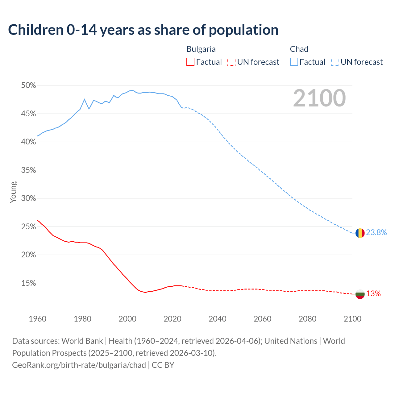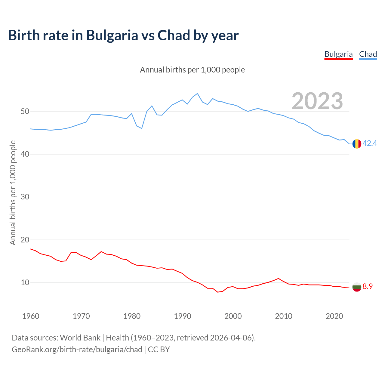Bulgaria has an annual birth rate of 8.9 births per 1,000 people, compared to 42.4 for Chad. The average number of children a woman is expected to have during her lifetime — the fertility rate, is 1.81 in Bulgaria and 6.12 in Chad — 238.1% difference.