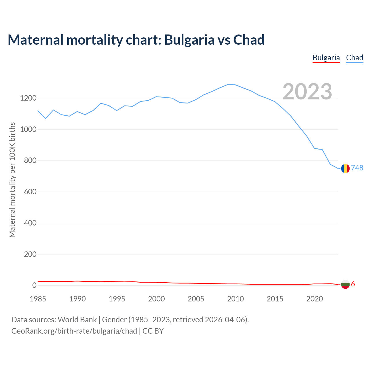 The maternal mortality rate, which is the probability of dying during childbirth or within 42 days of pregnancy termination, is 6 deaths per 100,000 live births in Bulgaria, compared to 748 deaths in Chad.