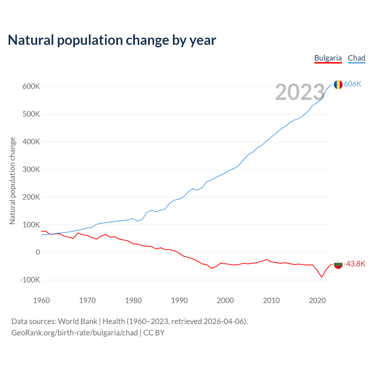 According to the latest available data on birth rates, the fertility rate in Bulgaria was 1.81 children per woman in 2023, compared to 6.12 in Chad in 2023. The replacement level is considered to be 2.1 children per woman.