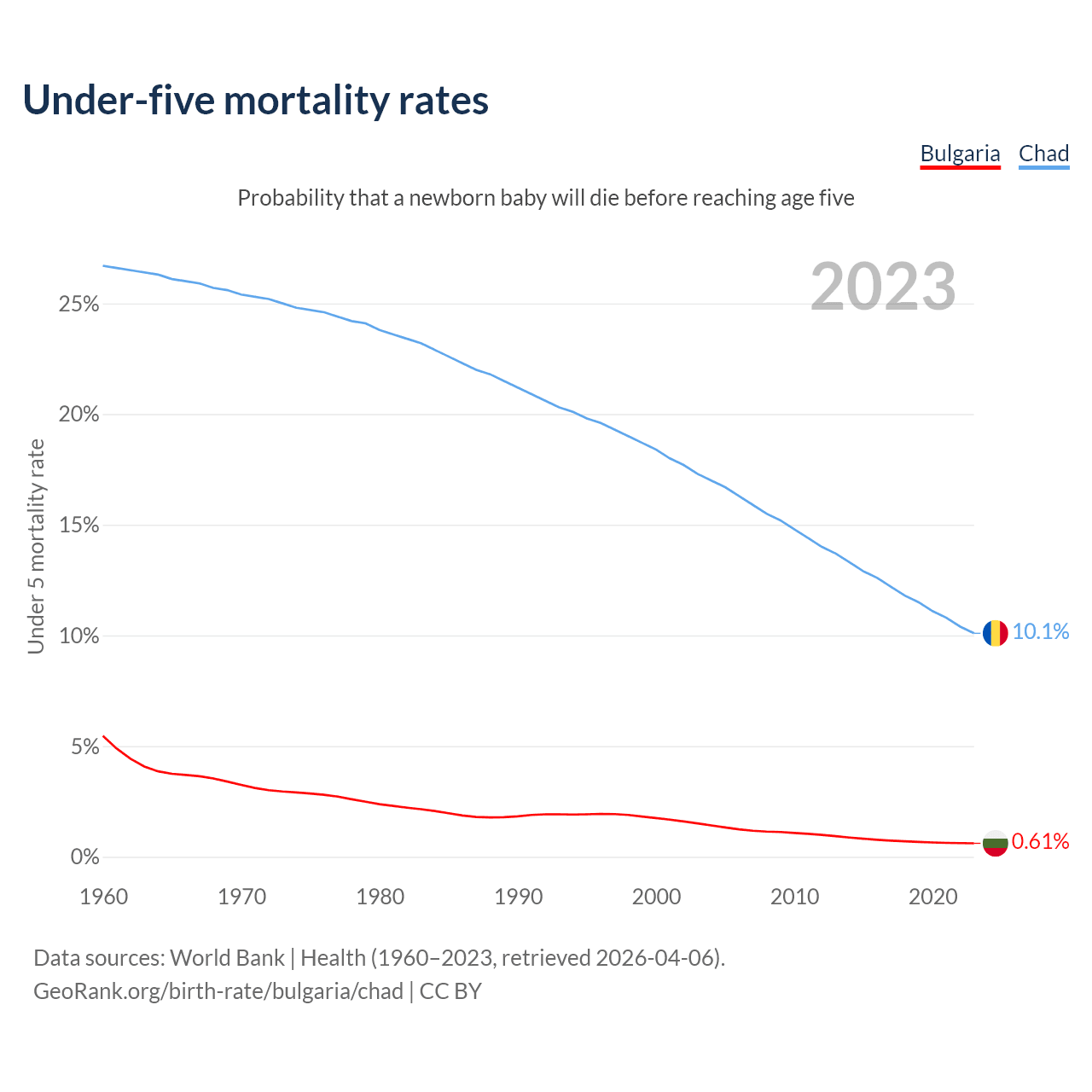The chance that a newborn baby will die before reaching age five is 0.61% in Bulgaria and 10.1% in Chad. Above is a chart with historical data on under-five mortality rates.