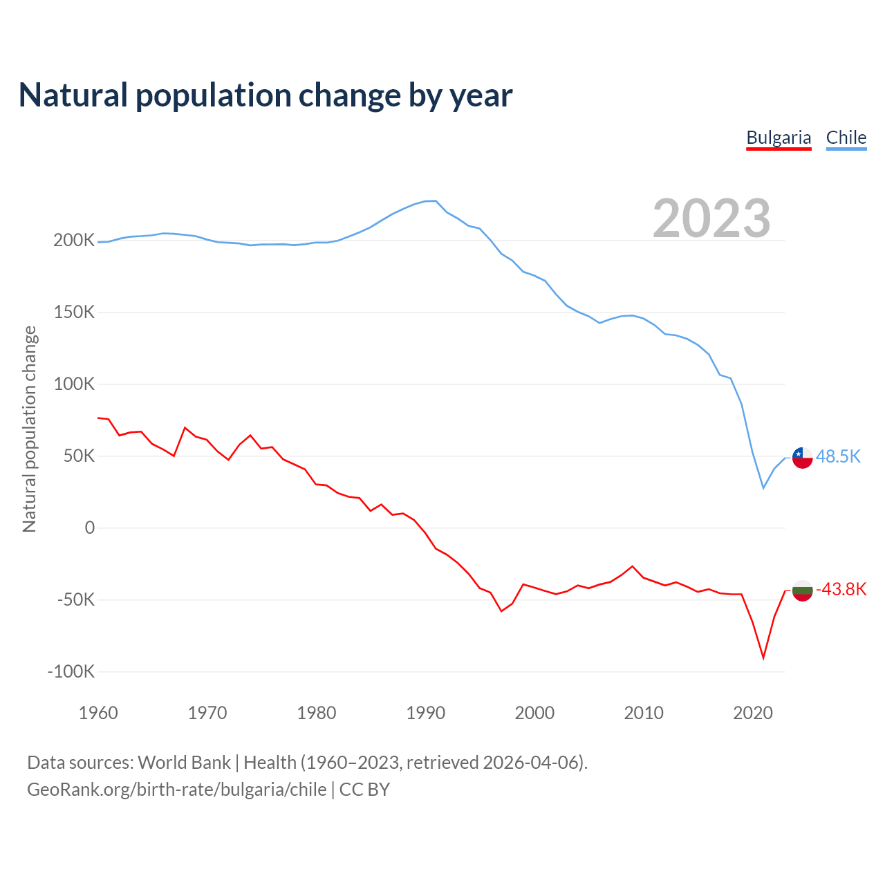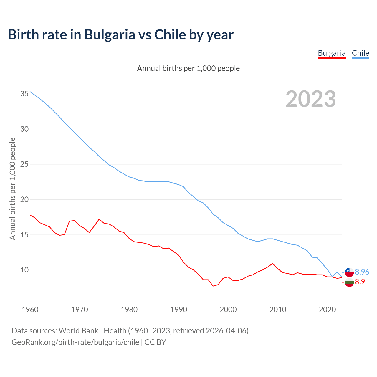 According to the latest available data on birth rates, the fertility rate in Bulgaria was 1.81 children per woman in 2023, compared to 1.17 in Chile in 2023. The replacement level is considered to be 2.1 children per woman.