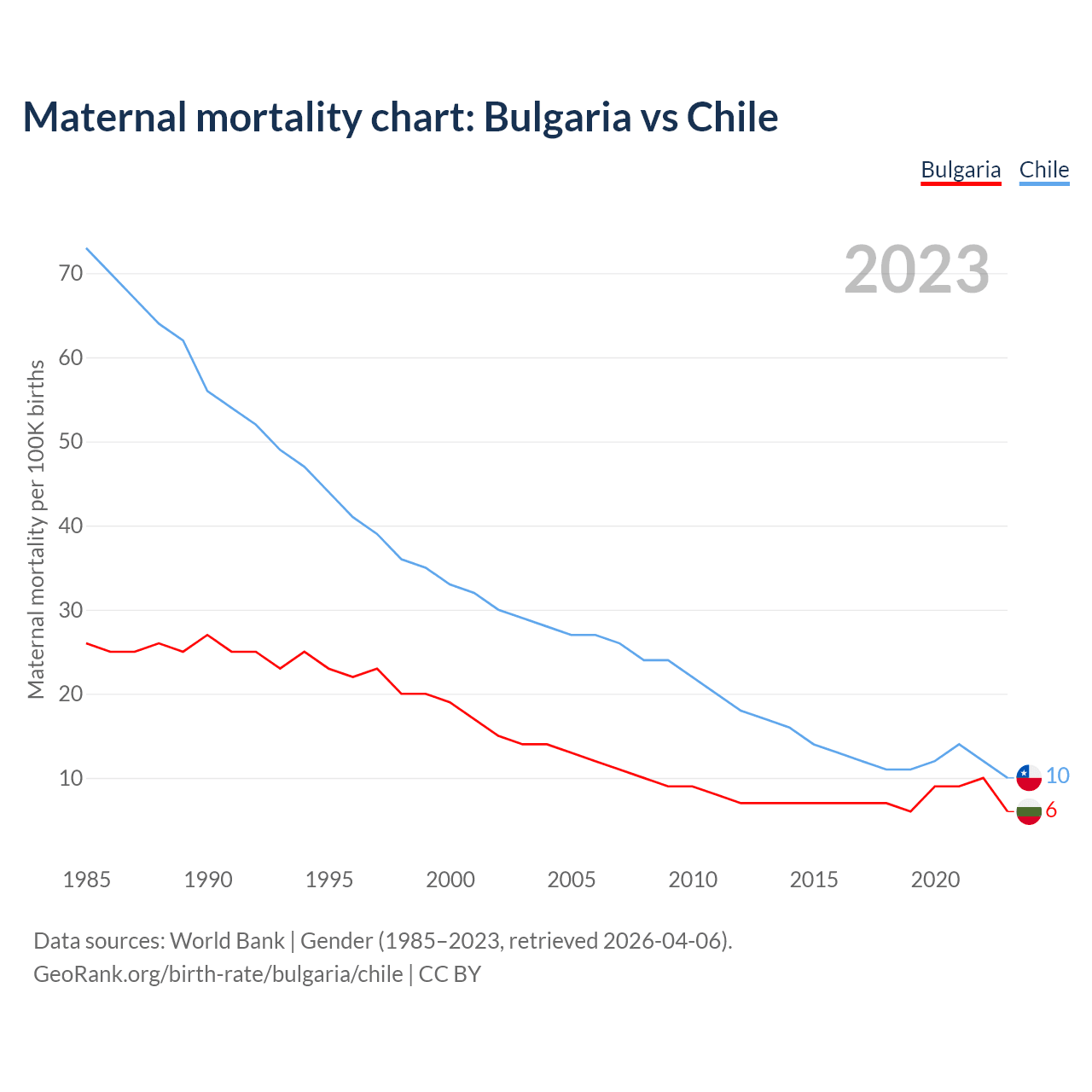 The maternal mortality rate, which is the probability of dying during childbirth or within 42 days of pregnancy termination, is 6 deaths per 100,000 live births in Bulgaria, compared to 10 deaths in Chile.