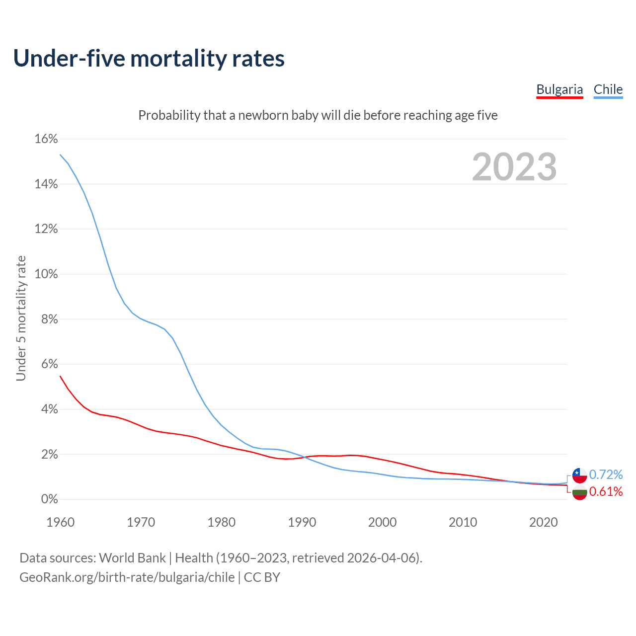 The chance that a newborn baby will die before reaching age five is 0.61% in Bulgaria and 0.72% in Chile. Above is a chart with historical data on under-five mortality rates.